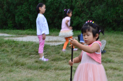 到了最高处,有一个塔,这个是不让上去的。开始下山了。下山处有一片空旷的草坪。我们再那里休息的同时,宝宝在那里研究起了登山杖。宝宝已经很熟练可以把这个登山杖变长变短了。