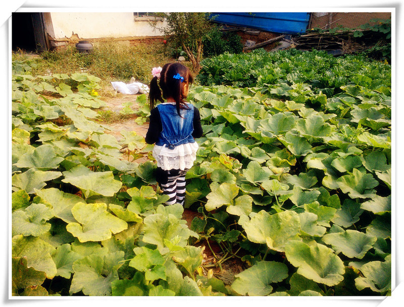 妞妞在老家玩的特别的开心,有琪琪有小慧,还有邻里的许多小朋友,妞妞和大家一起在村子里玩,特别的开心t快乐。姥姥家有个老院子,前些年还租出去,后来房子旧了不好往外租,就把院子开辟成了蔬菜园,里面种了一些家常吃的青菜。像豆角,韭菜,白菜,还有茄子青椒 什么的。这时候有些菜已经蔫了,但是南瓜却长的很好,妞妞姥姥说,她种的南瓜长的又大又甜,问妞妞要不要跟姥姥去摘南瓜?妞妞听了自然乐意的不行,跟在姥姥后面就去了老院子。 我去老院子找妞妞的时候,她和姥姥早就已经到了,妞妞正拿着一半石榴在吃。院子里的石榴树去年才种的,今年只长了三个石榴,今天就被妞妞给摘了一个吃。妞妞吃着石榴,我问她甜不甜,妞妞一边吃着一边说,甜!呵呵,妞妞在院子里转悠,她要让姥姥给她摘三个南瓜,而且要大南瓜,小南瓜妞妞不要。她一边走着一边看脚下,看到大南瓜了就跟姥姥喊“姥姥,这有个大南瓜~!” 好像发现了宝藏一样兴奋。 不知道这院子里种了多少棵南瓜,爬满了整个院子,那感觉有点像荷叶,只是比荷叶小了许多。妈妈说种了没有几棵,只是这东西太能长太好长,所以一下爬满了院子,结满了南瓜。明年就只有两三棵就好了,不会像今年这么多,但是肯定会够吃的了。妈妈摘了好几多南瓜,送给了邻居四个,然后把大的给妞妞留着,让妞妞带回家。妞妞美的不行,一个劲的说,“姥姥,我最喜欢吃甜甜的南瓜了~!” 在院子里用手机给妞妞拍的照片,隔了两天妞妞在手机上看到照片的时候对我说,“妈妈,我怎么走在水里了呢?” 呵呵,这小丫头以为这是荷叶呢,还走在水上,以为自己会轻功呐~ ![]() ![]() ![]() ![]() ![]() ![]() ![]() ![]() ![]()