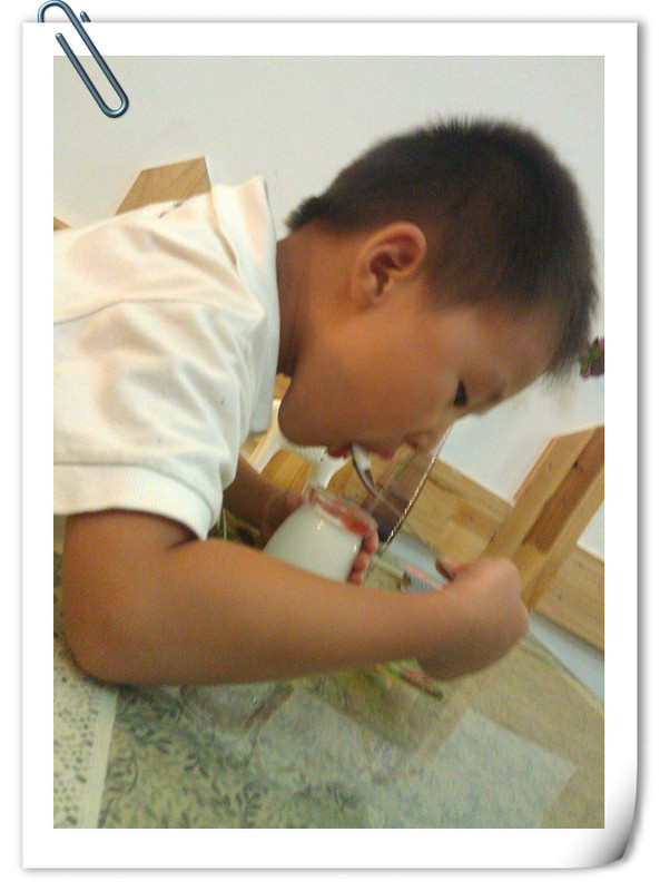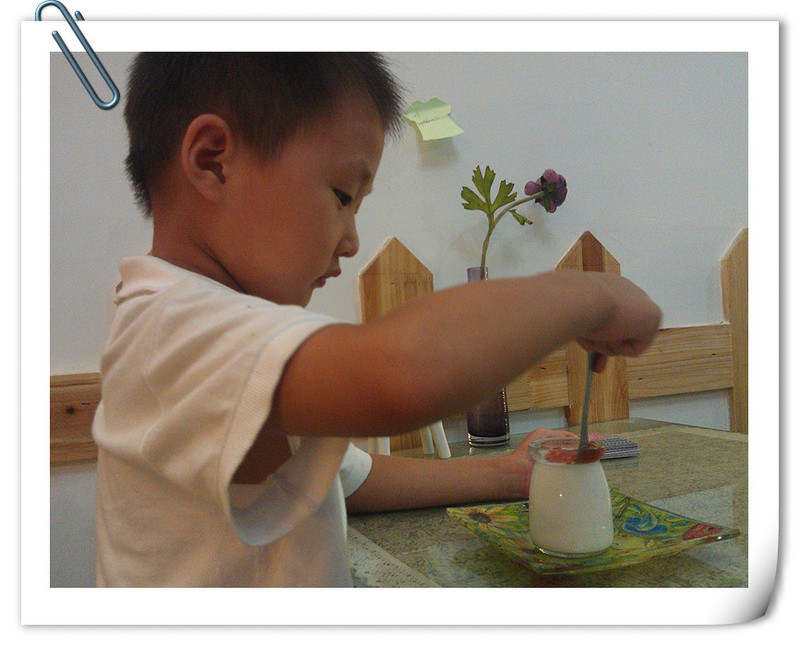因为是现做的甜品,所以等了好长一会儿时间才拿来了点点的布丁,点点拿起布丁就开始吃了,吃着吃着,点点说,这个玻璃杯子不知道能不能带回去的,我要回家养花,然后他就去问服务员可不可以把玻璃杯带回去,服务员说是不可以的,点点就只能不带回去了。