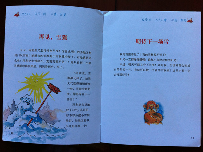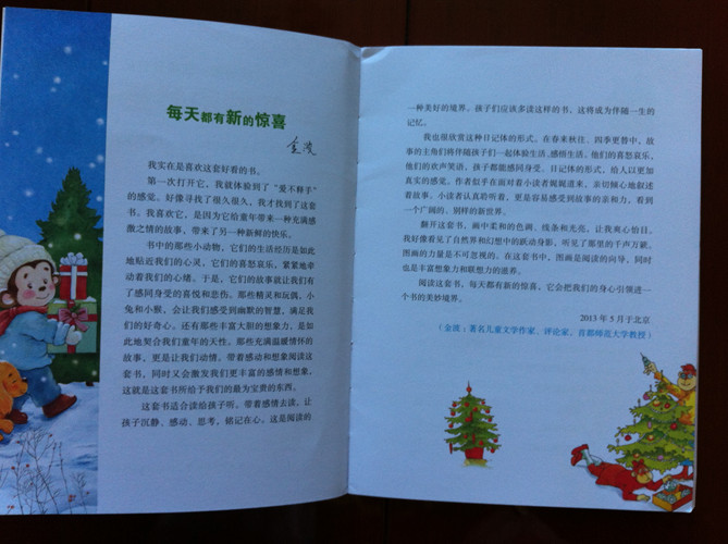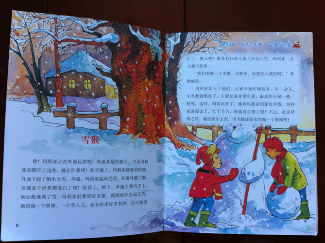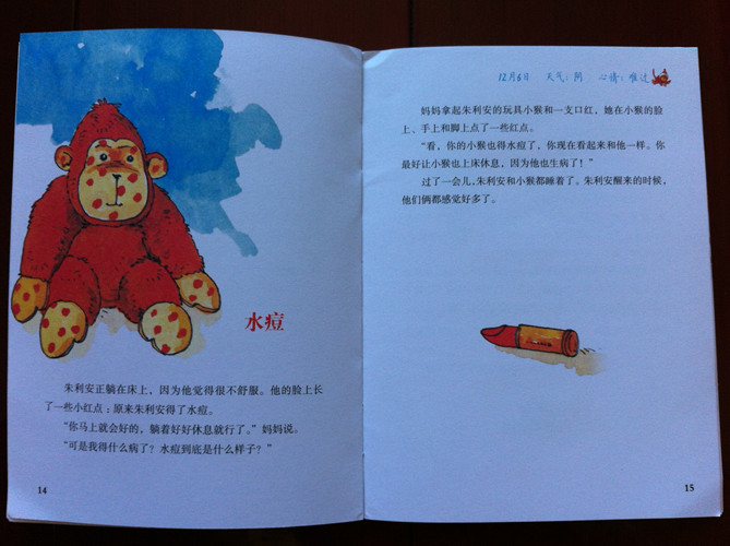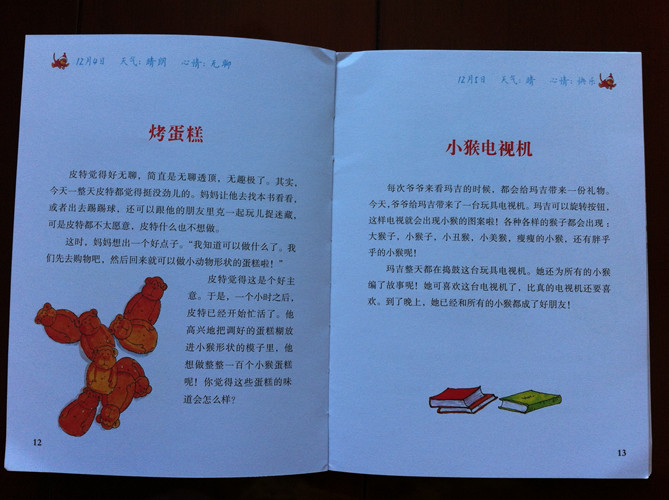 ![]() 为了培养孩子的语言能力,和对一件事的复述能力,从美妞大约开始上幼儿园起,我就和美妞养成了说日记的习惯,就是每天睡觉前,孩子说一件在幼儿园发生的事情,给妈妈听。妈妈说一件跟美妞没有关系的事情。美妞很喜欢这种形式。一直坚持到现在。虽然孩子说的东一句西一句的,但是想只要说了,就是进步。很想让孩子对日记的形式有进一步的接触。《淘气猴的妙趣日记》视乎向及时雨一样来到我们身边。 连忙翻看来看。序语篇,让我激动,让我兴奋,视乎找到了之路明灯。可是在往下看日记的内容,迷茫了。日记不都是记录一个人的事件的吗?这个日记怎么不是记录一个人的,名字经常换,日记的内容,看着像是几个人的拼凑的东西。这怎么给孩子讲呢?连忙去翻看网上知识。才知道:“我的第一套成长日记”是一套来自于荷兰的全新概念的童话故事书。故事按照春夏秋冬12个月排序,用日记体的形式讲述童话,主人公有聪明乖巧的小马驹,调皮捣蛋的小猴子,活泼可爱的小兔子,聪明勇敢的小魔怪……它们为孩子轮番上演着精彩好戏:淘气的小猴子们偷香蕉、掏鸟窝、打泥巴仗、抽爷爷的烟斗;聪明勇敢的小魔怪遇到凶猛丑陋的大恶龙的挑战、面对邪恶巫师的威胁;小精灵们从村子里搬到一座阁楼上,开始一段绝妙的长途旅行;其乐融融的小兔子一家在山洞里过着幸福多彩的生活,憨厚可爱的小笨象总爱做梦,他去了梦幻岛旅行……故事风格或幽默风趣,或惊险刺激,或温馨清新,配以色彩缤纷的插图,给孩子以耳目一新的阅读体验。 明白了原委,那么开始给孩子讲了,这本日记是发生在12月份的,整个日记的内容,都跟猴子有关,或是淘气的猴子,或是可爱的猴子,,,,并且跟我们的季节很是接近了,对于冬天给孩子一个预热吧。 美妞很是喜欢,看到写在纸上的日记。先看到时间,天气,这些好亲切。这些都是美妞每天必说的。开始给美妞读,美妞说太喜欢了,不能忍受每天读一个内容,要读两三个。就这样,一本日记,就让美妞大约八九天给读完了。 很喜欢日记的内容。每个都很短小,也把事情叙述完整。就像第一篇日记,是下雪了,一个叫玛利亚的小女孩用雪搭雪猴。美妞看到很期望,什么时候这里也下雪,我也要搭雪人。但看到水痘篇,知道,这是一种病,会让人很不舒服。滑稽的脸蛋,发现日记竟然简单到,可以记录冲妈妈鬼脸就了,看到痒痒的套头衫,美妞说姥姥也给我织了一件毛衣,那么我也可以作为日记来说的是吧妈妈,,,,,, 虽然每个日记都是独立的,但是一点也不影响读,通过这样一个书的形式的关于日记的阅读,美妞对于日记有了更深的体会,希望在以后我们的说日记中,美妞能有所提高。到用书写的时候,日记已能是水到渠成的能力。 ![]() ![]() ![]() ![]() ![]() ![]()