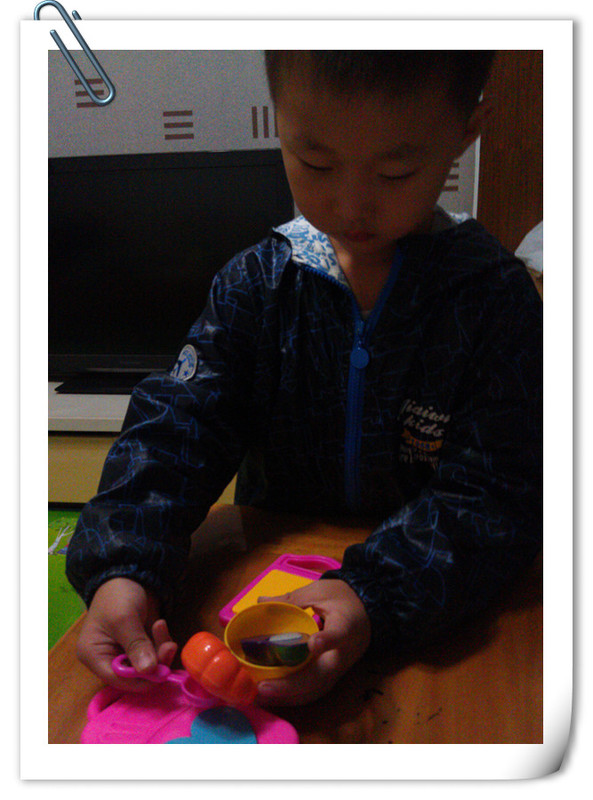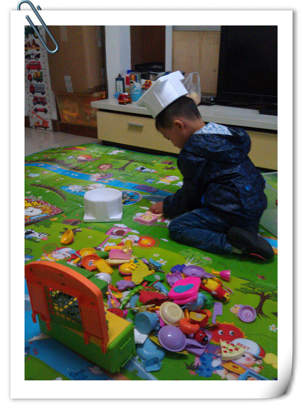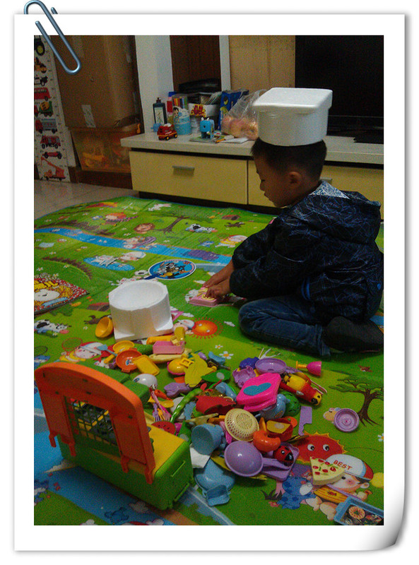 小厨师来了 点点和很多小朋友一样,在家里喜欢玩小厨师的游戏,每次与玩沙的时候也会玩小厨师做饭的游戏,上周我们收到的法国伴宝乐婴儿有机奶粉里面的包装是泡沫盒子,点点正好拿来做厨师帽子,点点说,一半是厨师帽,一般就做大碗吧。 点点戴着厨师帽就开始他的小厨师旅程了,每次点点玩小厨师的游戏,都要妈妈在旁边打下手,给点点大厨师洗菜啊,传递工具啊什么的,还真像大厨师的样子呢。