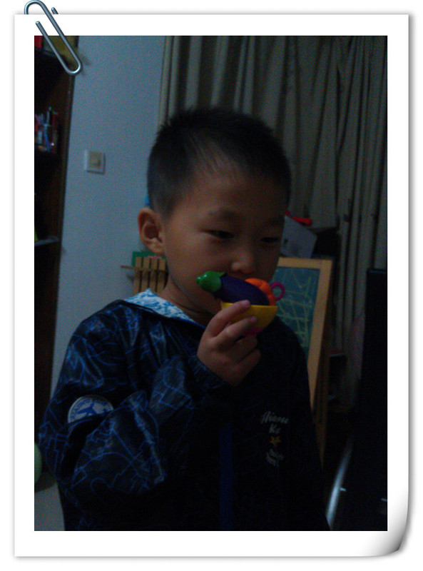 点点说他想吃烧茄子,然后用大虾烧茄子,烧好以后就自己吃起来了,吃得津津有味呢,真是可爱的孩子,剩下的四盆菜就给妈妈和爸爸吃,我说妈妈先吃吧,点点说要等爸爸回来一起才好吃的,这样只能等着爸爸一起回来吃了。