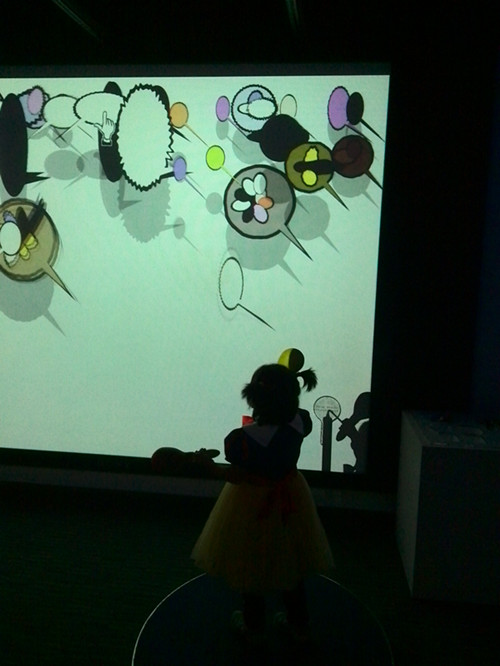 这个魔法教室感觉进入了魔法的世界,不过,因为时间的关系我们这里的活动没有参加上。但是,工作人员很贴心,后来又为我们演示了一个魔法实验。就是用湿答答的手指去不停的摩擦杯口,这样便会发出声音,而且杯子中的水放得不同,发出的声音也会不同。宝宝也尝试了一下,还真的可以发出动听的声音呀。 这是共振环。宝宝正在旋转开关感受每个环之间的变化。 小剧场的时间到了,这个舞台剧的表演也是很不错的,故事很有意思,音乐也很动听,最主要的是融入了科学知识。让小朋友们学到了一些科学道理。 这个是制作动画的,每次设计一个场景,最多30个,连接起来就成了一幅动画。宝宝作了好几次才肯走呢。 自己的影子变成了五颜六色出现在光环中,好漂亮的影子呀。可以让小朋友们感受到颜色的重合变化。我过去后,整个颜色都变成了黑色,宝宝忙让我赶快离开呢。主要是影响人家感受和探索了。 看看这个是什么呀。这是我们三个人合成的一个人,很神奇吧。 这是带着什么眼镜呢?原来是看三D电影所带的眼睛呀。很酷吧。 马上就要开始观影了,看看我们在探索海底的秘密呢。有许多海洋中的小动物,感觉我们来到了美丽的海底世界中游玩。 来试试自己的嗓子吧,喊出一个大圈圈,不过是圆的。 这个圈圈有些吓人呀,周围还带刺呢。宝宝感觉这个很有意思,一直扯着嗓子喊呢。宝宝发出的声音全变成了各种符号,确实是很奇特呀。