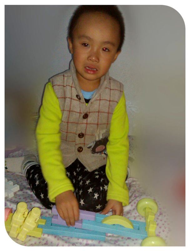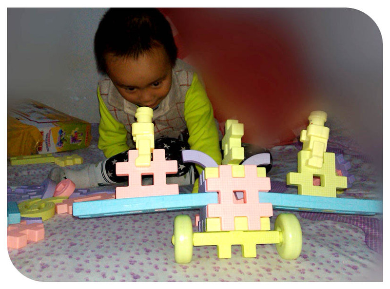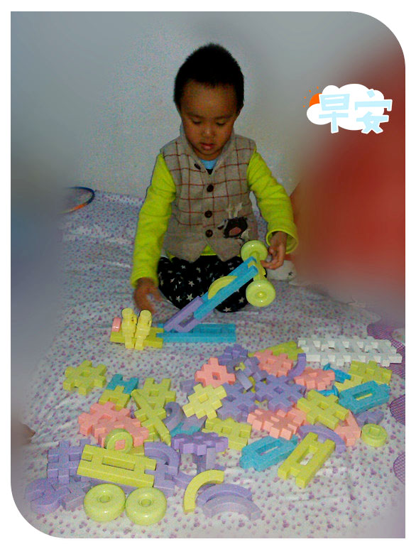 周日的事情,周六晚上谦是在姥姥家住的,第二天早上5点半就起床了,一贯的早睡早起啊。起床就想着玩点啥呢,小家伙想要玩积木。于是拿出那个可以拼插的积木一股脑的给这小子倒了出来,这下子随便玩吧!小家伙投入的拼插起来,很快一架大炮就完工了,很简单的拼插,而且还有两个人负责开炮呢,如果不是小家伙自己介绍说是大炮,估计妈妈是看不出来的,因为人家的炮管上居然还有两个车轮子呢,很奇妙吧,不过看着小家伙一本正经的解说妈妈也是鼓励宝贝拼的不错!