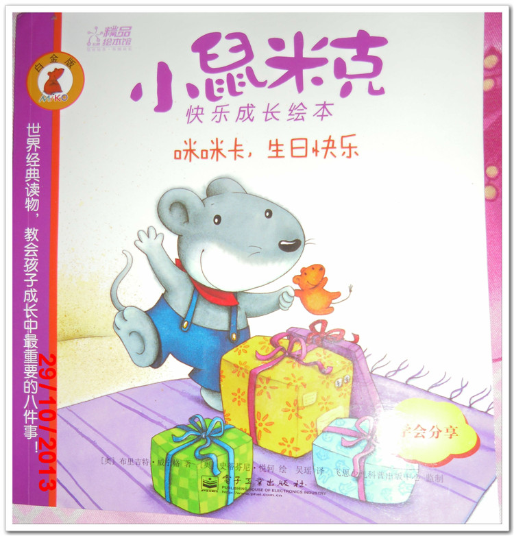 ![]() 阅读时间:10月31日 参与人员:妈妈和宝宝 阅读绘本:《小鼠米克之“咪咪咔过生日”》 绘本特色:成长绘本书,教给孩子如何与小朋友一起分享 适读年龄: 0~6岁 阅读心得:再一次读《小鼠米克之“咪咪咔过生日”》让孩子有了更深一层的理解,宝宝喜欢过生日,每年过完,还会意犹未尽地问“妈妈,为啥不能天天过生日呢”?我告诉他“生日只能是出生的那一天过,为了记住你是那天出生的,一年只有一天是相同的,也就只能一年过一次”,宝宝显示有点不赞同“那我啥时再过”,呵呵,听,还过上瘾来了。 宝宝的前两个生日都在幼儿园里过的,尊重孩子的意见,因为幼儿园里的小朋友更多,所以过起生日更快乐。就是这本书《小鼠米克之“咪咪咔过生日”》一样,双人生日,虽然咪咪咔没有生日礼物,但小米克愿意把自己的礼物分一半给咪咪咔,这样不仅不会减少什么,而且得到了双倍的快乐,何乐而不为呀! 通过读这本书,让孩子更加明白分享的快乐,因为快乐也需要同朋友分享才更加地快乐! 本作品未经作者许可不得转载,转载请征求作者意见。擅自转载使用,将保留追究其法律责任的权利! 个性签名