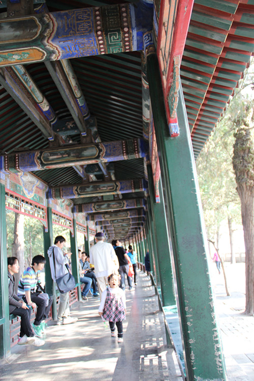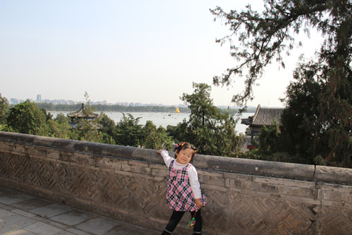 因为母亲之前来过,所以知道大黄鸭在新建宫门那里。这样,我们便没有必要再往如意门那边逛了,直奔大黄鸭。 万寿山的时候宝宝还因为没有给自己拍照而闹情绪呢。后来过了隧道照了像宝宝才高兴了。 看看在万寿山上远远的可以看到大黄鸭了。 我们先是从万寿山下来后到了长廊,我们从长廊里面边走边听宝宝的号令。宝宝说她是老师,我们都是学生,男生站一边,女生站一边,男生和女生要拉上手哟。宝宝一开始让我和老公拉手走,只要分开,宝宝马上命令让我们拉上手好好走。后来,我问宝宝,那姥姥呢。宝宝想了想,没搭理这个茬。我们又说这老师怎么也一个人走呀?要不老师和姥姥拉上手,这人多了,走丢了怎么办呀。宝宝估计是听到这个丢字了,马上转过身,让老公和母亲拉手,而让我拉她的手。这可不行呀,大家都表示反对。宝宝则说,那这样吧,还是你们俩拉手,我和姥姥拉手好了。就这样,我们一直手牵着手走到了昆明湖船只停靠处。