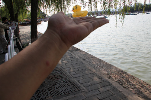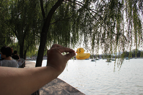 大黄鸭观看结束。再为大家展示一下老公拍的特技照吧。 捏住大黄鸭的嘴了。 将大黄鸭拖入手中。