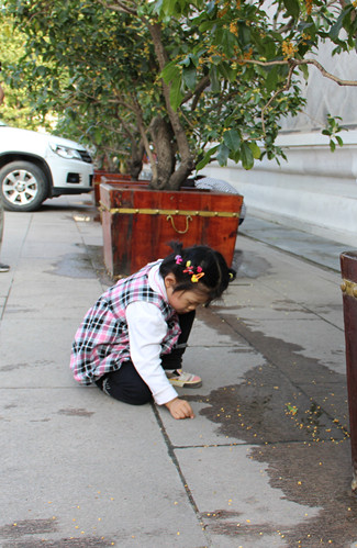 接着我们又来到银桂花前,上前一闻好香呀,宝宝正在捡种子给老师呢。 在文昌院前玩起了吹泡泡。