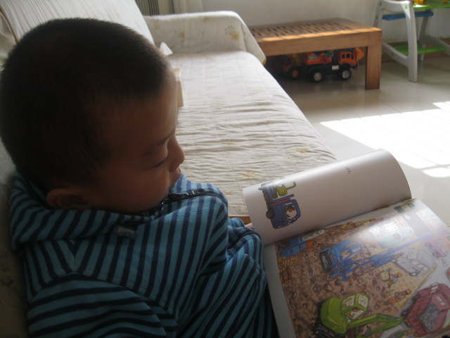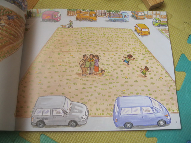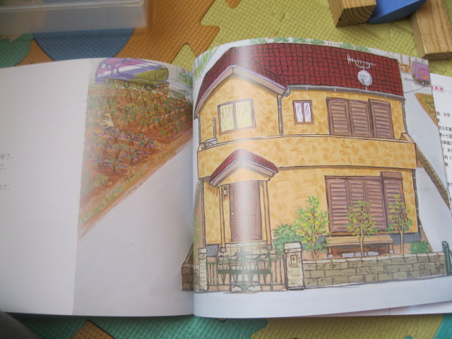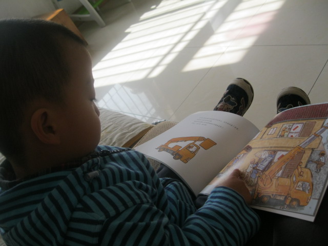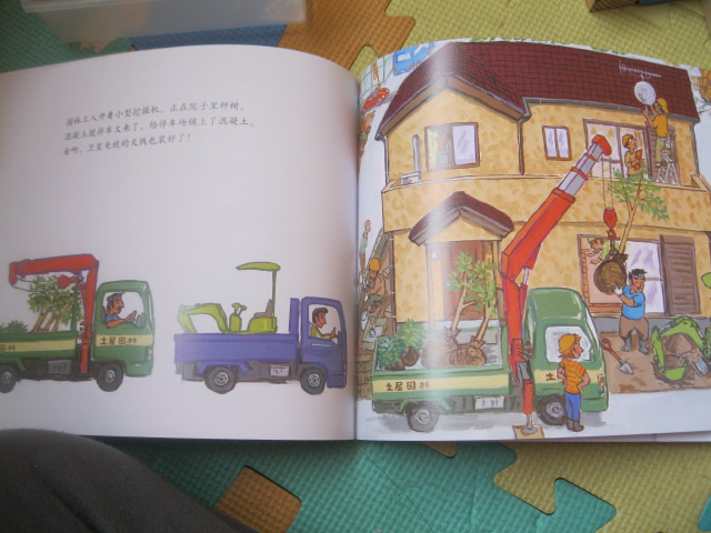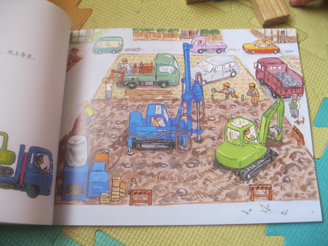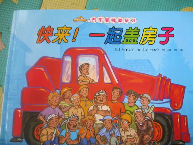 我家是男宝,特别喜欢车,从几个月的时候抱出来玩,就对车子非常敏感,每一辆车子经过都要从头看到尾,现在可以通过声音辨别消防车、救护车等。 家里有很多车子的玩具,每天嘟嘟嘟的玩个不亦乐乎,总是有新的花样出来,有一个托马斯的小火车,开起来肚子里有铃铛当当响,也成了孩子的最爱。或许,从出生那刻起,车子与男孩就紧密联系在一起了。 自从去年遇到了《汽车嘟嘟嘟》系列图书,本来对车子就非常喜欢的我家宝贝,更是对车子着迷的不行,其中那本《咔嚓,挖掘机》被翻烂了,《快跑,宅急便》也经常看,封皮也已经被翻得做旧了。由此我记住了铃木守和竹下文字这两个黄金搭档,买了《小巧手游戏书》、《铃木守的车世界》,几乎每本都非常喜欢,每天晚上,躺在被窝里和他一起亲子阅读成为一件快乐的事情。 家里有很多关于车子的绘本,有的侧重于介绍知识性的东西,每页上都有一辆车子,简单的告诉孩子车子的名称,可以帮助孩子认识很多车子。而铃木守的每套车子的书都是和故事联系在一起的,所以孩子不仅收获的是知识,更多的是知识之外的乐趣。 能够让孩子快乐地享受阅读的美好时光,一直是我们家亲子阅读的一个宗旨,孩子想读的时候读,不想读的时候就在那里放着。汽车嘟嘟嘟以前是五册,这次宝宝带带推出试读活动,有幸得到另外两册的其中一本《快来,一起盖房子》。我家窗户外的空地上正在盖房子,场景和绘本中的很相似:也是右边在干活,左边是菜地种菜,正好我家在盖房子旁边也有块菜地。从绘本中,我和孩子一起用挖掘机挖土、混凝土搅拌机浇筑水泥、用木头搭建房子、然后涂抹外墙、安装水电……每一页都和现实故事相连,我和孩子边玩边看,乐趣无穷。