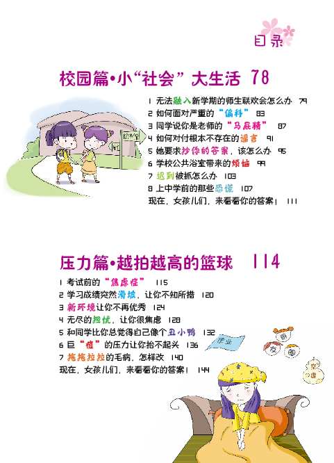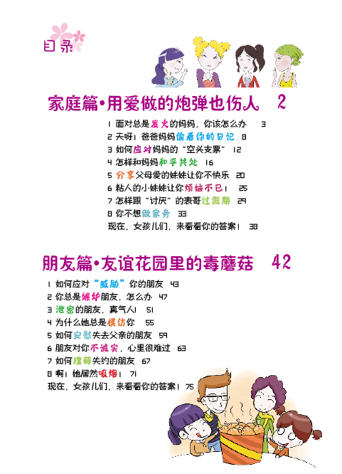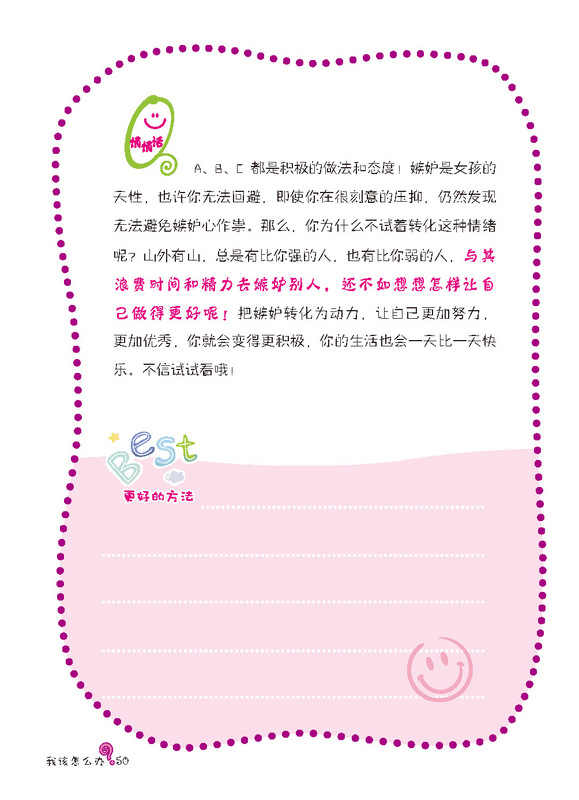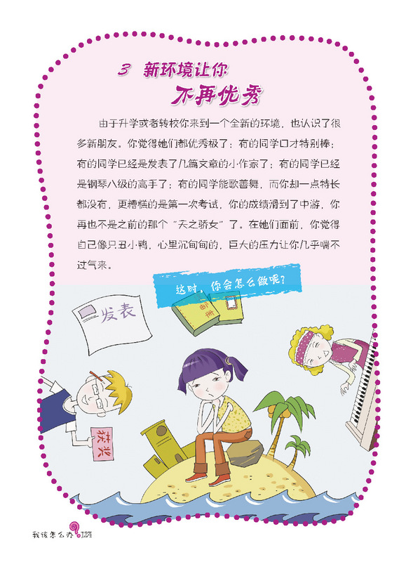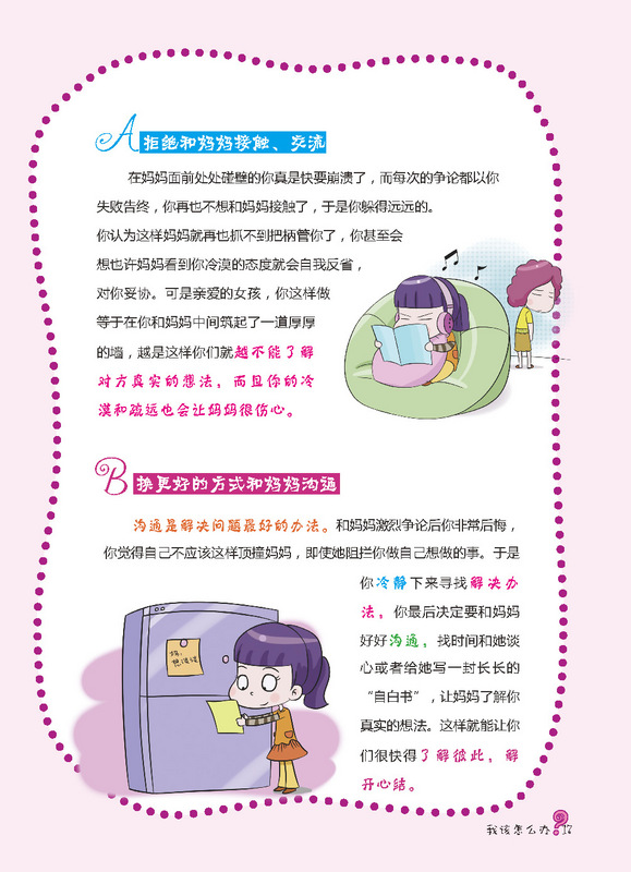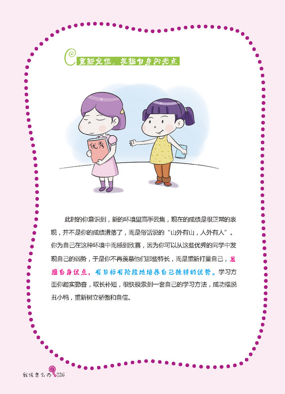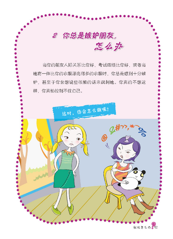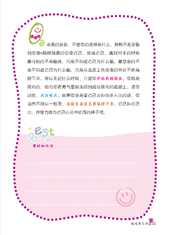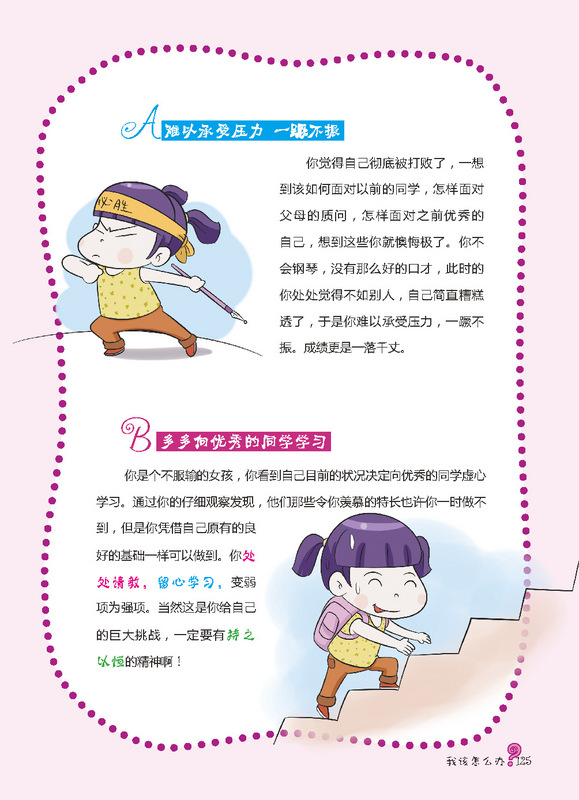 孩子,你会怎样做? ——大胆地说出来,还是当事情没有发生过? (对现实生活中遇到的问题做出你的选择,做真实的自己) 《我该怎么办?-女孩成长关键期的典型心理困扰》是针对时下独生的孩子们,如何正确看待日常生活中有关家庭,朋友,学校,学习上常出现的小问题小状况!让他们学会多方位思考和解决这些困扰,才能更有利于快乐生活,这些思路会引导孩子从小有一个良好的问题解决观! 这是一本藏满你性格小秘密的书。青春期就像美丽的罂粟花,美丽且藏满危机。在这段时期内你会发现自己有各种困惑和迷惘。家庭、友谊、学校,突然间各种问题都盘根错节的将你团团包围……你一时间不知道如何应对,不知道求助于谁。不要害怕,这本书将会是你的“青春宝典” ,它不仅会教你如何做出正确的选择、如何正确处理身边发生的问题,它还会传授你更多的处世技巧,让你轻松应对各种烦恼。 在这里,你会了解到,像你一样的孩子是怎样处理生活中遇到的各种问题的。你会发现有许许多多的孩子们有着和你一样的困惑,那么赶快拿起这本书吧,她将是你看到的中国最美的性格引导书!