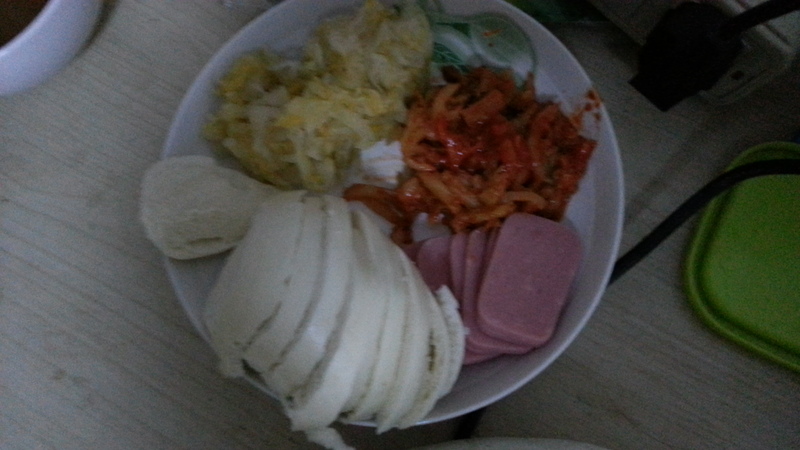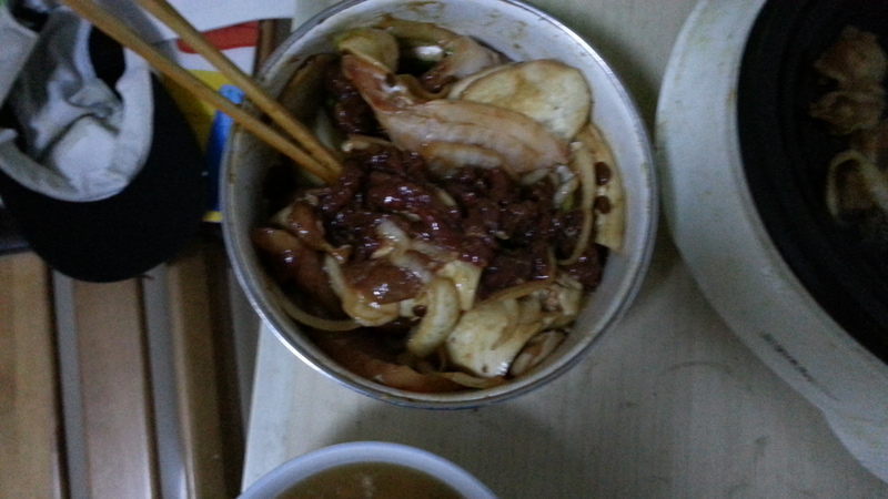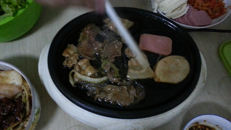 烤炉很简易,只有加热,没有调节温度,肉是经过腌制的,这家伙还做了调料,不过肉腌制的有点咸了,调料就用不上了,不过我觉得调料调的很好吃。肉切的很薄,放上面很快就好了,卷上生菜,味道还真是不错啊,不比外面的差。