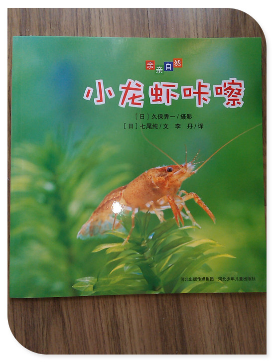 昨天晚上宝贝的亲子阅读是和爸爸进行的,大概看了3本的亲亲自然,其中孩子最喜欢的就是这本《小龙虾咔嚓》了。当爸爸给谦读绘本名字的时候小家伙也跟着说“咔嚓、咔嚓”,快乐读书的一个开始。瞧瞧封面这只小龙虾多么的生动啊,那个触须,那个爪子,那个夹子又让看到的人有了想动手的念头了。如果没有读故事只是看书名的话以为咔嚓是形容小龙虾夹子的动作呢,但是看过之后就明白这只小龙虾的名字叫做咔嚓。当咔嚓还是一只没长大的幼仔的时候身体是透明的,钳子也是小小的,没法熟练地捕捉到猎物,连正颤蚓也捉不到的时候只好吃水草的叶子了。(看画面就会发现正颤蚓就是平时喂鱼的鱼虫而已)小龙虾咔嚓不怕姐姐的嘲弄,他相信自己的钳子很会就会长大的。慢慢的,小龙虾经过了蜕变的阶段,这组画面孩子看的非常的仔细认真,7副图画将小龙虾蜕皮成长的过程完整生动的呈现出来。以后又经过几次蜕皮后小龙虾的钳子变得更大了,不用躲藏在壳里,并且有生以来第一次捉到了小鱼,最后咔嚓成了水里的小霸王了。