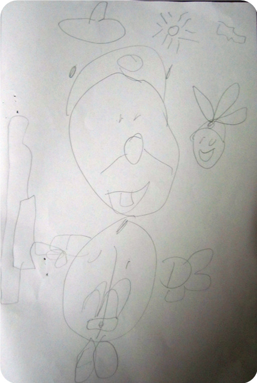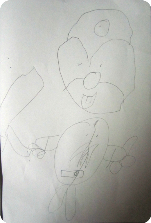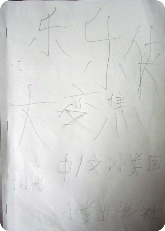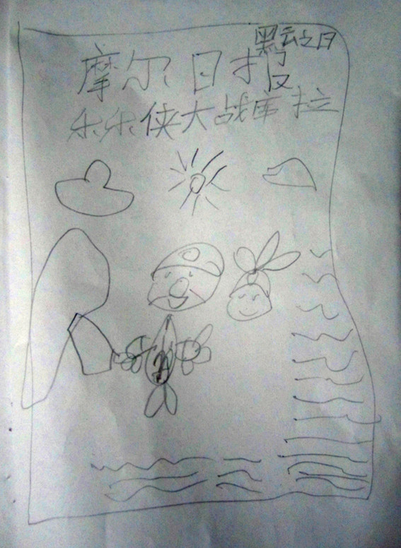 这个月一号开始,小娄同学又在家休息了。所以除了雨天,我们一般上午都会出去玩的,下午回来,我会抓紧时间上上网,而这个时候小家伙一般会自己看看书,画会画什么的。也算是互不干扰吧!因为这家伙一直在家,所以很多东西一天到晚都是乱糟糟的,有时我看到给他收拾了,有时我也懒得管。前几天,小家伙的书桌上就堆了一堆的东西,多数是画了些画的白纸,那天大致扫了一眼,好像画的是乐乐侠。因为小家伙一直没有主动拿给我看,所以我也没在意。而对于乱糟糟的书桌我也没心情管了。后来我真的庆幸,我没有那么勤快,让小家伙有了足够的时间创作他的书。 昨儿小家伙突然神神秘秘的告诉我,他的书要做好了!“书?”我挺惊讶的!小家伙神秘兮兮的说:”等我订好了,给你看!“没多会儿,小家伙就送来了一本所谓的”书“。《乐乐侠大变焦》 中/文:小娄 图:小娄 小娄出版社 看着封面我就乐了!学得像模像样的嘛,不过那”版“可写错了哦!呵呵…… 就这样我一页一页的翻看着。说实话,在小家伙没有给我做讲解的时候,我看出了他画的是什么人物,可我真的没有看出他的用意。可在小家伙给我讲解后,我真的震惊了!他让我想起了,前几天小家伙不停的在翻看着我家两本书的情景。原来如此啊!小家伙是在那找到的灵感!不过最后一页,小家伙做的不够明显,我给小家伙提了一点建议!而小家伙也欣然接受了,马上进行了修改!最终小家伙的第一本真正意义上的书诞生了!因为小家伙之前也做过书,可那些书都是一些简单的画推砌而成的,没有什么变化,而这本真的不一样了!大家是不是也很好奇啊?!那就让我带着大家来欣赏一下,小娄新鲜出炉的新书《乐乐侠大变焦》吧!