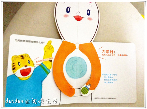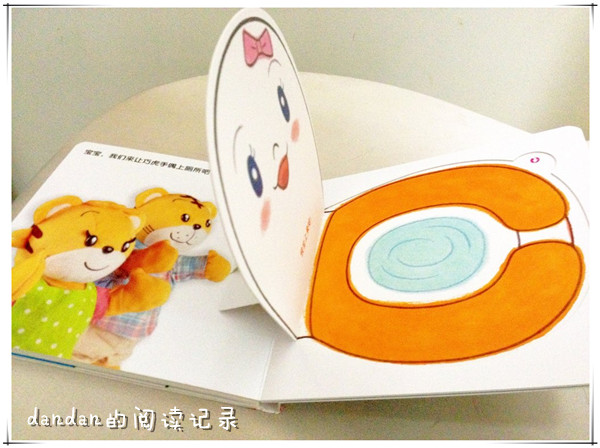 ![]() 阅读日期:11月14日 参与人员:妈妈和宝宝 阅读绘本:《我去上厕所》 绘本特色:培养好好上厕所的好习惯。 阅读年龄:1~2 阅读心得: 快2岁的这个年龄,正是训练宝宝如厕的好时机。 看到很多宝宝都会自己上厕所,不用包尿布,俺是相当羡慕啊……不过之前因为懒,加上看到很多人说不用过早训练宝宝把屎把尿,所以我也就都没给蛋蛋做这方面的训练了,只是每次便便的时候告诉他,有便便要说,有尿尿要说。 现在似乎便便的之前都会预告啦,跟我们说,“有嗯嗯!”有时候来不及到厕所,他自己还会说“忍住!”哈哈 趁着这期巧虎,赶紧给儿子训练下吧! 这本翻翻书讲的是上厕所的故事,巧虎爸爸躲在一格格的小房间里,每个房间门都可以翻开,大部分是小动物在里面,只有一个门里是爸爸。这也可以和宝宝玩蛮久,比如也可以通过门外露出的小动物耳朵,来猜里面躲的是谁。 然后就是马桶的介绍啦~~,这个马桶可以翻的,翻开蓝色的水,还可以看到里面的臭便便。 ![]() 马桶盖也可以翻开。 最后一页还有马桶的立体造型,可以用手偶玩具放在马桶上面玩模拟拉便便的游戏。 ![]() 看完这本书,蛋蛋现在最喜欢做的就是——冲厕所!汗一个~~~ 每次在卫生间,他都要冲厕所,还要跟我们说,“蛋蛋冲” 似乎听着哗哗的水声,他也很满足。 本作品未经作者许可不得转载,转载请征求作者意见。擅自转载使用,将保留追究其法律责任的权利! 个性签名