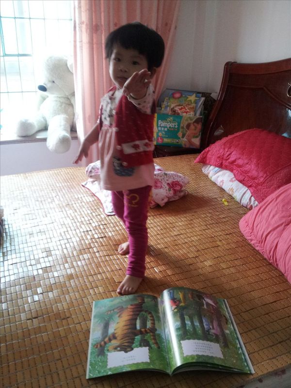 在这本书里她最喜欢模枋的是老虎,哈`~~每次她模枋老虎的样子,都把我给逗乐得不行。当然也因为她现在平衡感还不那么好,她时常在模枋的时候就会摔倒在床上。不过每次摔倒她都依然乐呵呵的,乐此不疲的继续模枋老虎。
