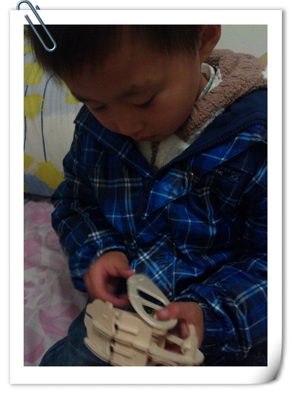 这个木制拼装积木,是在一次活动中得到的奖品,当时点点还小,还不能独立完成这样的拼装积木,所以我就等点点大一点再给他玩吧。星期天的时候,点点就想要拼装这个积木,可是爸爸妈妈没有时间陪点点一起做,点点拆开来了没有自己看图纸做,就算是自己做也要大人在旁边指导一下的,凭他自己看图纸自己制作好像还不能独立完成。于是昨天晚上,我们拿出积木,妈妈陪点点一起做,首先我们打开积木,我发现积木少了几片,还到处找,找到了每一片积木,我们才能开始拼装。