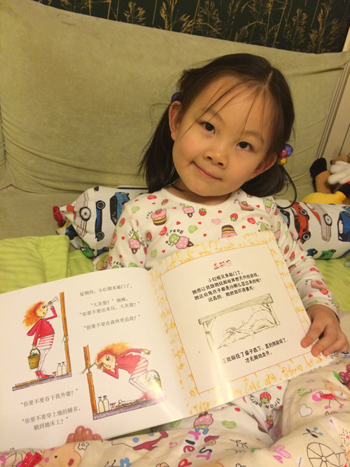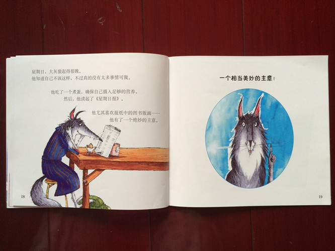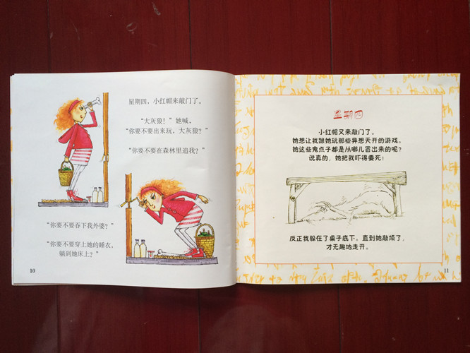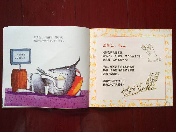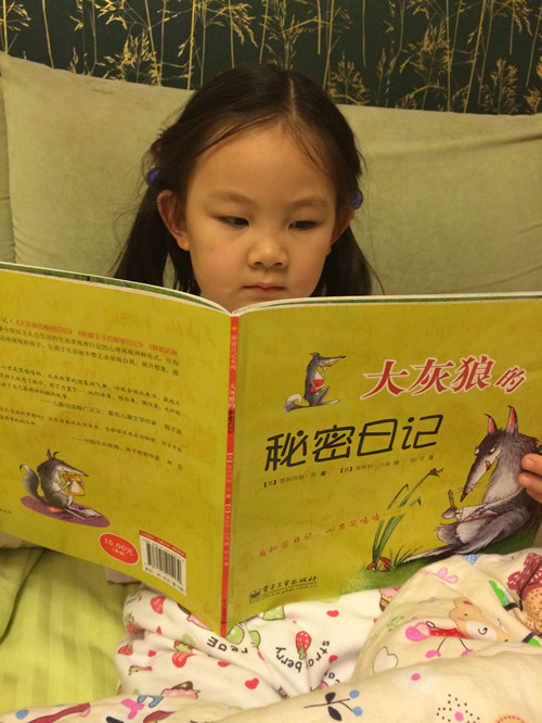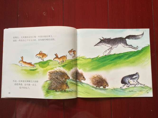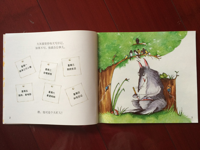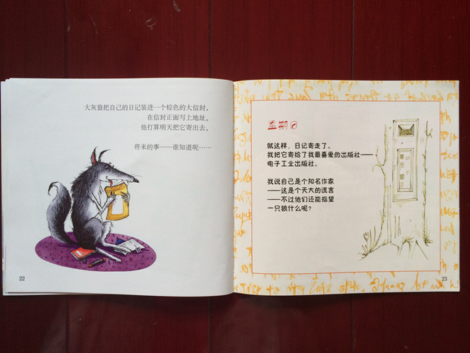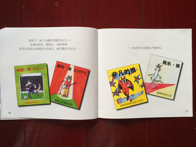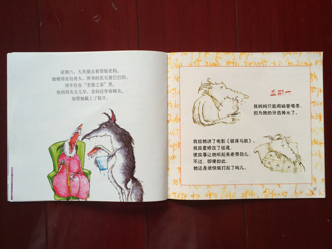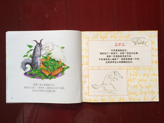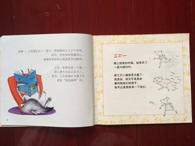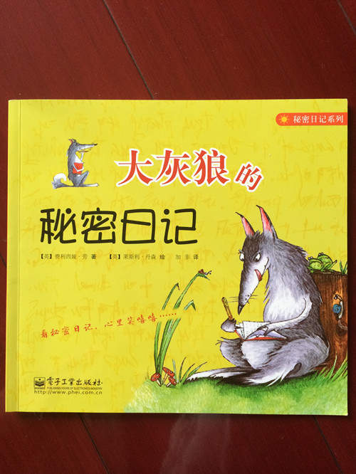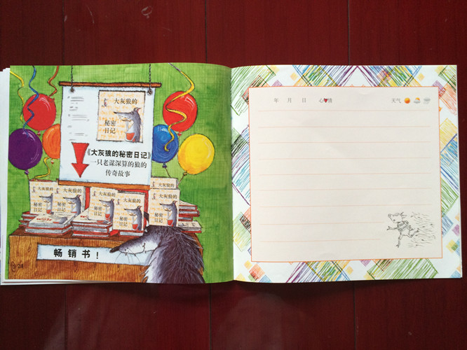 ![]() 自从收到《大灰狼的秘密日记》已经五天了,这五天的晚上,美妞临睡前,必读的书就是《大灰狼的秘密日记》。跟美妞协商,都读过来,咱们换换吧。美妞不同意。说妈妈你不给我读,我就不睡觉。 昨天晚上临睡前,和美妞一起泡脚,美妞说,妈妈我给讲故事吧。好啊,给妈妈讲什么故事呢?美妞说,我给你讲《大灰狼的秘密日记》。“大灰狼喜欢写日记,周一的时候,它去捉弄小猪去了,周二的,大灰狼和其他狼练习合唱,准备演出。周三,大灰狼过生日,可笑的是,礼物是自己给自己买的,周四,小红帽来敲门,来找大灰狼玩。周五,大灰狼看电影,那个故事它不喜欢,周六大灰狼去看妈妈了,它的妈妈非常老了,住在老狼之家。周日,大灰狼有了一个绝妙的主意,它把它的日记寄到出版社。然后大灰狼的日记成畅销书了。” 讲完故事的美妞问我:妈妈你知道,我最喜欢哪页吗?我说,我不知道。美妞说:她最喜欢小红帽来敲大灰狼家的门。我问为什么?美妞告诉我:因为小红帽很勇敢,大灰狼可是会吃人的,我虽然很担小,可是我要向小红帽学习,要做勇敢的孩子。 那大灰狼有秘密吗?美妞说:没有秘密。为什么没有秘密啊,大灰狼的日记不是秘密吗?美妞说:妈妈大灰狼的日记最后不是变成书了吗!还是畅想书呢!大家都知道了它的秘密。 (以上是孩子对《大灰狼的秘密日记》的看法) 很吸引人的一本书,故事情节非常的简单,就是大灰狼,每天都写日记,记录白天发生的事情,并且抒发一下感想。 很有突破的一本书,每天所记录的内容,一反常规。大灰狼日记的内容,都是我们平常知道的故事,像三只小猪,大灰狼的日子中写道:“那三只小猪真是太愚蠢了,我是说,我又不是真的,要吹倒他们的房子,我不过是想捉弄一下他们”。还有,星期四的内容,我们印象中的小红帽都是要被狼吃掉的,可是大灰狼的日记中说到:“她想让我跟她玩那些异想天开的游戏,说真的,她把我吓得要死,反正我躲在了桌子底下”。 可以学习的一本书,大灰狼把它的故事,都给推翻了,从内心进行了一次独白。这种想法,太赞了,每个人都有弱点,那么很少人敢于承认。从而让孩子知道,承认是新的开始。 可以学着写的一本书,对于已经五岁多的美妞来说,这本说,正好让孩子学习日记的写法是什么,简单的说一件事,然后可以说说你的看法,或是意见,还可以记录你自己身上发生的事情,去检讨,去成长。 一个孩子常常阅读这样的文学故事,心里是笑嘻嘻的,也在故事的想象间飞舞,呼吸会因此爽活,激发片刻,抒情片刻,生命的节奏就不是片刻而是持久地有了秩序,有了力量,,,,,他们读着,想念着,模仿着,也许就成了一个很会写作的人,结果创造性地写出了自己最精神抖擞的故事。 一起来读《大灰狼的秘密日记》吧。 ![]() ![]() 大灰狼坚持每天写日记,如果不写,他就会忘事儿。看看一周多繁忙,做了很多的事情。这个大灰狼多么专注的在写,很多小动物都吸引来了。 ![]() 星期一是大灰狼忙碌的一天,他把周围的人气了个半死。为此,大灰狼的日记是这样写的“星期一,晚上回家的时候,我累坏了,一直气喘吁吁。那三只小猪真是太蠢了!我是说,我又不是真的要吹倒他们的房子,我不过是想捉弄一下他们”。大灰狼这样解释戏弄三只小猪的原因,不是想吃他们,而是捉弄啊。 ![]() 星期二,大灰狼干什么去了,对是去参加合唱了。一群狼挤在一起,齐声嚎叫。看看狼原来也是音乐的爱好者,为了音乐的美梦,凑在一起高声嚎叫着。 ![]() 星期三,是大灰狼的生日,他给自己买了礼物,还给自己送了贺卡。日记是这样记的:“今天是我的生日,我收到了一张贺卡,还有一份生日礼物,那是一件漂亮的羊皮大衣。大衣穿在身上棒极了,我感觉就像一只羊。这是我有生以来最棒的生日”。一份造假的日记,为什么?因为大灰狼不想生日过得那么孤单。可是这样子,就真的像是披着羊皮的狼了。 ![]() 星期四,小红帽来了。小红帽来敲门,并且喊:大灰狼你要不要出来玩,你要不要在森林你追我,你要不要吞下我外婆,你要不要穿上她的睡衣,躺倒她床上?为此,大灰狼是这样记录他星期四的生活:“小红帽又来敲门了,她想让我跟她玩那些异想天开的游戏。她这些鬼点子都是从哪儿冒出来的呢?说真的,她把我吓得要死!反正我躲在了桌子底下。直到她敲烦了,才无趣的走开了”。看看,平常吃荤食的狼,不去吃小红帽和她的外婆,而是被小红帽吓得要死,躲在了桌子底下。说明狼偶尔也是胆小的。 ![]() ![]() 星期五的大灰狼决定做一些狼该做的事情,对了就是追赶小动物,兔子好欺负,就去追兔子。可是不是所有的动物都好欺负啊。刺猬就是一个特例,狼吓跑了。知道为什么吗?秘密! 星期五的晚上,大灰狼看了一部电影《彼得于狼》。于是有了这样的日记:“电影的开头还不错。狼抓住了一只肥鸭,整个儿吞下了肚。我觉得,这只狼真聪明!不过,我不太喜欢电影的结局。狼被一个叫彼得的小孩子抓住,送到动物园。这样的惩罚太过分了。只因为吃了只鸭子”! ![]() 星期六,大灰狼去看望妈妈。她的妈妈很老了了。住在老狼之家。为此星期六的日记是这样的:“我妈妈只能用吸管喝茶,因为她的牙齿掉光了。我给她讲了电影《彼得于狼》,我故意修改了结尾,使故事让她听起来更带劲儿,不过,即便如此,她还是很快就打起了盹儿”。这是一只善良的狼,为了让妈妈高兴,故事更改了电影的结果。