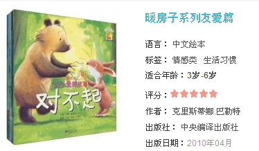 20131122《贝尔熊之对不起》——友谊更重要 阅读日期: 11月22日 参与人员:HENRY妈妈和宝宝 阅读绘本: 《贝尔熊之对不起》 绘本特色:这本书适合开始交朋友、意识到“友谊”的孩子。 适读年龄:3-8 阅读心得: 彤彤有一年没有去过爸爸海边的宿舍了,趁着今年冬天不太冷,妈妈决定带彤彤去“回忆”一下,而且海边绿道已经建好了,跟彤彤记忆中的海边完全不是一回事。 如果只是我们去,无聊了点。就邀请一些彤彤的好朋友吧,也趁此机会让孩子们聚聚,平时上课,星期一到星期五都不敢带孩子出来玩,也只有周末了。而且我们还安排了妈妈们表演节目:变魔术、讲故事,都是彤彤和朋友们最喜欢的。 偏偏这个晚上,彤彤闹别扭了,哭着说不要煜煜碰她的书,不喜欢这么多小朋友来她家,不喜欢HENRY怎么样怎么样。 幸亏家长们都很包容彤彤,妈妈才没出丑得太厉害。然后,HENRY妈妈就选了一个跟彤彤情绪有关的贝尔熊主题绘本来读:《《贝尔熊之对不起》。 贝尔熊和好朋友小兔子吵架了,谁也不理谁,可是没有朋友太寂寞了,他们最终选择了向友谊“妥协”,互相说“对不起”。从此他们又有伴玩了。 其实彤彤是个普通的孩子,妈妈的教育也有不到位的地方,不过,我相信她也是喜欢友谊多过孤单的,只是需要时间思考。