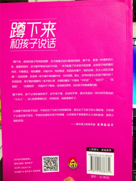 亲子教育再次掀起高潮,我想这样的一部书很值得推荐——《蹲下来和孩子说话》,这本书被认为是“好父母”说话技巧训练营手册。亲子沟通,就从父母蹲下来的这一刻开始。放下家长权威的架子,和孩子做朋友,用爱与尊重作为引导,让孩子拥有一个健康快乐的童年。