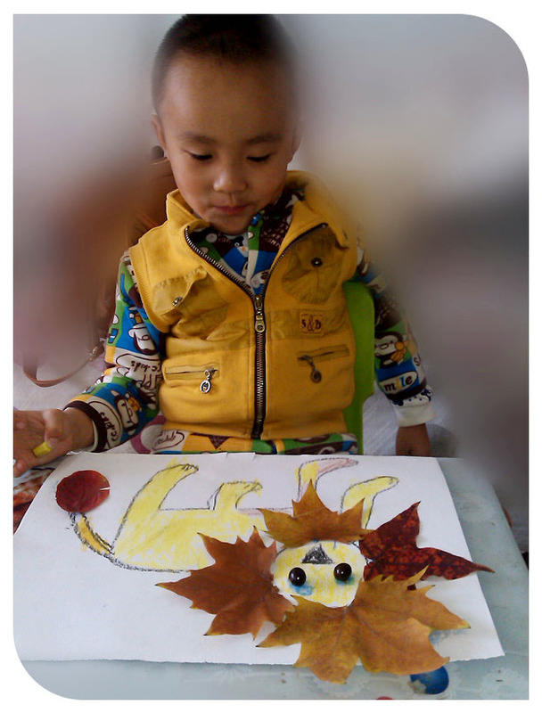 最近这几天带着宝贝做了好几次手工了,秋天落叶多,所以要是不用树叶带着宝贝玩贴画那真是可惜了这纷纷落叶了。树叶还是谦在周末的时候上完美术课后在回家的路上特意捡的,当时小家伙还挺有兴趣的,原来看到落叶的时候更多的是喜欢在上面踩踩跳跳的蹦的欢,要么就是找根长棍子抽打树叶玩,这次还真是难得的专心致志挑选树叶了,小家伙检树叶有个特点,喜欢树叶的颜色基本上都是偏红黄的,翠绿的叶子反倒是不入眼,无所谓了,这要看孩子的喜好,喜欢就好!
