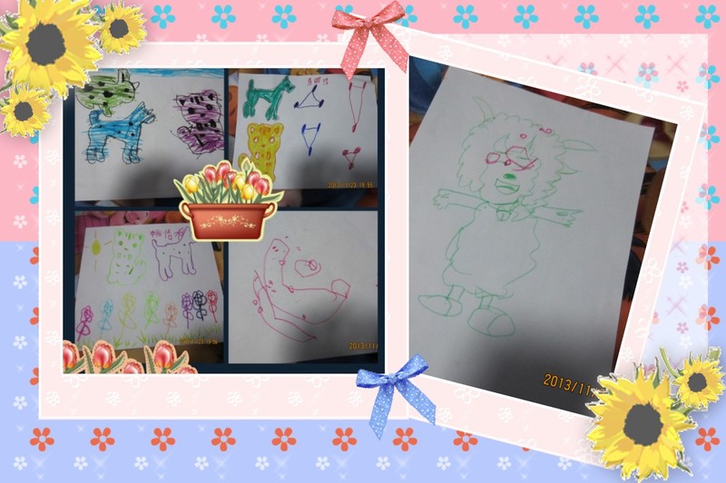 第三个环节是绘画环节,孩子们都在努力地画着,妈妈们却在一边聊天,好在孩子们没有反对,小宝依然是有模有样的画着,看,图片中最简单最原始的线条画就是宝宝的杰作,到底画的是什么呢?这需要我们发挥想象力,看看这抽象派大师到底画的是什么?哈哈。我好不容易画了张不太像的羊羊,被宝宝给添上了一副不规则的眼镜!看上去好像头上还有花?
