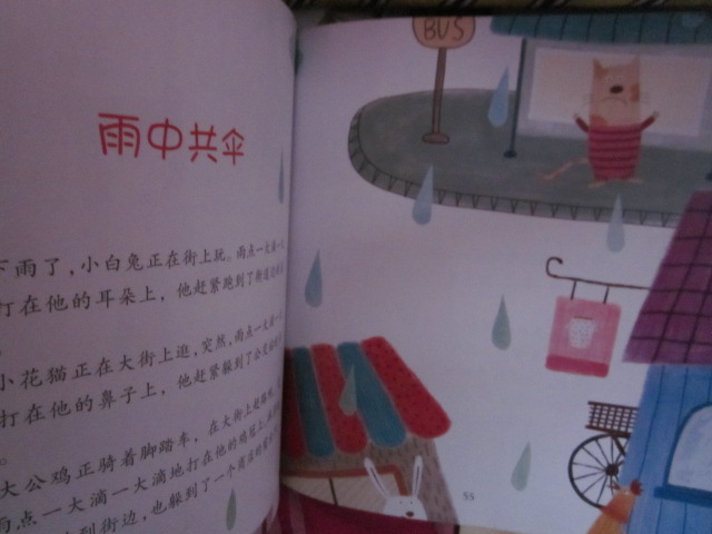 阅读日期:11月24日 参与人员:宝宝和妈妈 适读年龄:2-8岁 阅读心得: 一个关于交朋友的故事,很适合幼儿园的小朋友哦,简单叙述一下故事内容为,下雨了,小白兔正在街上玩,雨滴一滴一滴的落下来,砸在小白兔的大耳朵上,他赶紧的跑到了街道的屋檐下,小花猫正在街上逛,也被雨淋到了,躲到了公交站的雨棚下,大公鸡也骑着脚踏车在赶路,雨点落下来,砸在他的鸡冠上,他也赶紧躲到商店的窗台上,小白兔,小花猫和大公鸡一边躲着雨一边心里想,如果这时候有个熟人拿着雨伞,从这里经过就好了,可以一起回家了,这时候,花斑虎打着大大的伞过来了 ,小白兔看他是住在自己家附近的花斑虎,可是平时都很怕他,不敢说出自己的想法 ,这时候花斑虎看到了小白兔,就邀请他一起撑伞回家,小白兔看花斑虎这么热心就同意了,路上有遇到了小花猫,花斑虎说小花猫家离自己家也不远的,其实小花猫也害怕花斑虎,可是在花斑虎的邀请下,也一起撑伞回家了,最后遇到大公鸡,当然也是跟他们一起回家喽,以前不说话的几个人因此也成了好朋友。 很不错的一个小故事, 本作品未经作者许可不得转载,转载请征求作者意见。擅自转载使用,将保留追究其法律责任的权利! 个性签名