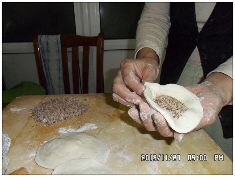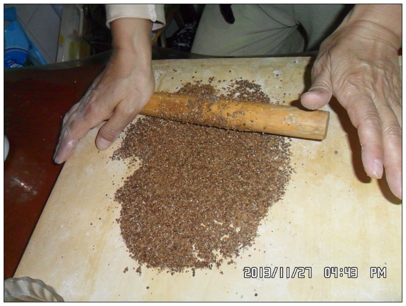 来看看制作的过程吧,还是非常简单的,先来和面,和可以烙饼的面,软一点好。 然后再来看看这就是传说中的苏子,一小粒一小粒的,颜色有点棕色。 ![]() 首先把苏子用擀面杖压碎,然后放上适量的白糖和少许的面粉,放面粉是因为怕糖会太遇热后流出来,这样混合一下会好很多。 ![]() ![]() 先把面擀成一个大饼,里面放上少许的油,然后卷起来,再揪成一块一块的小面团,擀成饼,然后像包馅一样把混合好的苏子陷包在里面。最后就是放在锅里烙一下,出锅就是这样黄黄的了,卖相还不错吧? ![]() ![]() ![]() ![]() ![]() ![]() 苏子饼吃在嘴里又香又脆又甜,还真是不错!吃起来的感觉好像芝麻馅,但是又不太一样,总之很特别的感觉,最重要是有爱的感觉在里面,老爸对家人的那份心意,等我学会了也做给他们吃。