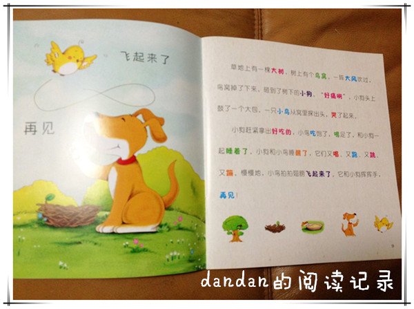 ![]() 阅读日期:11月29日 参与人员:妈妈和宝宝 阅读绘本:《语言启蒙:字词训练》 绘本特色:学会新的词汇。 阅读年龄:1~3 阅读心得: 昨晚看完午饭,今天蛋蛋就会说后续的故事啦,说小兔子给小熊吃虾;小猫给小熊吃蛋黄卷…… 进步真快! 最近话越来越多,所以语言启蒙这套书可以继续看看咯~~~ 这本字词训练,主要是训练宝宝说一些非名词性的词,蛋蛋很喜欢封面的这个彩色鸡蛋,哈哈。 通过书中的好几个小故事,每一页都有对应词汇的图画,在讲故事的过程中,让宝宝通过画面来记住这些词汇。 ![]() 一天讲一个故事吧~~~ 今天讲的是第一个故事——小狗和小鸟。 有一只小狗在大树下乘凉,树上有一个鸟窝。一阵大风刮过,鸟窝被风吹掉下来,正好砸在小狗的脑袋上。 小狗唉哟大叫了一声,只见脑袋上被砸了个好大的包。 过了一会儿,掉落的鸟窝里钻出一只小鸟,小鸟哇哇大哭。 小狗见了,拿出好吃的东西给小鸟喝,还给小鸟喂了水。吃饱喝足的小鸟睡着咯。 醒来后的小鸟和小狗一起快乐的玩耍,慢慢滴,小鸟开始学会了飞翔,飞起来的小鸟盘旋了几下之后,和小狗道别再见咯~~~ 本作品未经作者许可不得转载,转载请征求作者意见。擅自转载使用,将保留追究其法律责任的权利! 个性签名