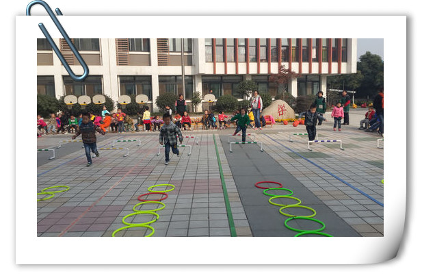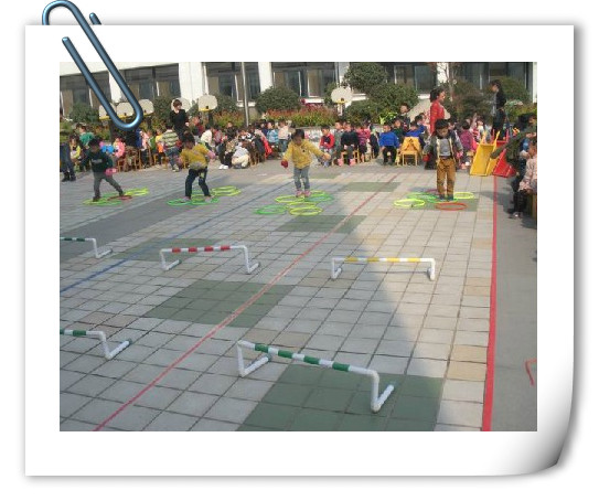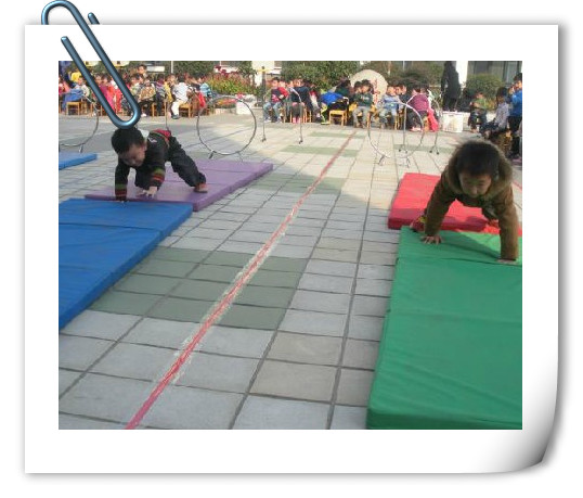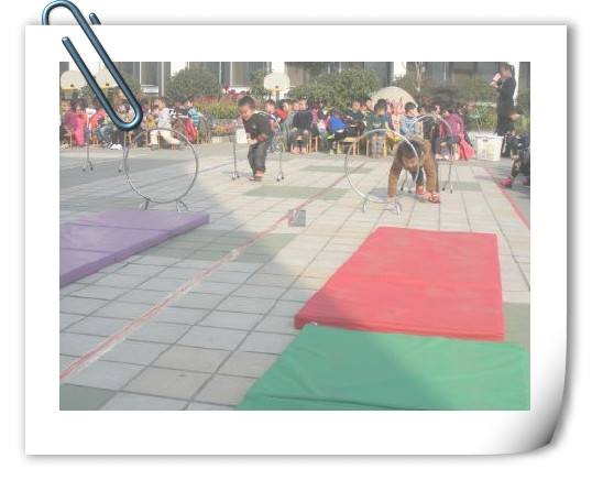 小勇士的运动比赛是先要钻三个椭圆圈圈,然后爬到对面,再回来,点点说他钻圈圈的时候,圈圈没有倒,做得很棒呢。
