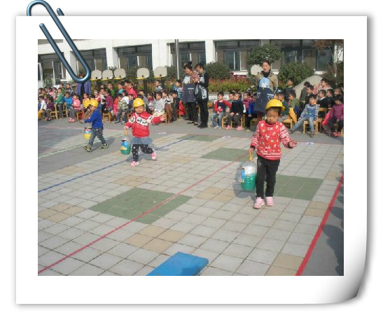 在每一个运动项目中,小朋友们使出浑身解数,施展自己的本领。在小小运水工中,小朋友们还全副武装呢,戴着工程毛,手提水桶,稳稳地走在平衡木上面,来回走一圈,很快就到了目的地。这个运动项目锻炼孩子的平衡能力。