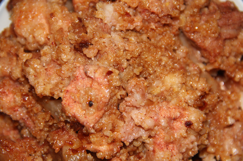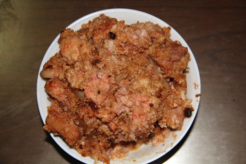 先看看这个粉蒸芋头 ![]() 其实蒸菜的做法相当简单,事先要准备好蒸菜粉,超市有现成的蒸菜粉卖,一般都是加了调味料的,只需要往待蒸的菜里搅拌均匀,其他什么调料都不用放,直接上锅蒸熟就行了。以我家的经验,现成的蒸菜粉都咸,调料放太多了。我们就将白米用搅拌机打碎,拌在菜里,再放些盐,蒸熟了之后,再用香油回锅炒几下,这样蒸出来的菜清淡可口,还有一股香油的味道。不过素蒸菜粉适合蒸素菜,如果蒸肉或者排骨的话,还是要放些其他调料的。 这是粉蒸肉 ![]() 颜色和粉蒸芋头比起来就深多了,如果也用白米当蒸菜粉蒸肉,蒸出来的肉就寡淡无味,不那么可口了。荤腥的菜还是入味一些比较好吃。再拍一个粉蒸肉的特写看看: ![]() 选肉的时候,不能选纯瘦肉,太瘦的肉蒸出来发干,嚼起来也不容易嚼烂。稍微带些肥肉,蒸出来肥而不腻,口感适中,也易于消化。敬仪超级喜欢吃姥姥的这些拿手好菜,看看小家伙,吃得多带劲呀!! ![]() 家里买的现成的蒸菜粉过期了,姥姥就用的白米蒸菜粉加上老干妈一起蒸的肉,老干妈里调料多,还有辣椒。敬仪不能吃辣,姥姥特意先把敬仪的蒸肉盛出一部分来,剩下的再拌上老干妈再蒸。 为了敬仪,姥姥没有少费心思啊!!姥姥辛苦啦!!感谢您为我们所付出的辛勤劳动!敬仪长大了一定好好孝顺您!嘻嘻。