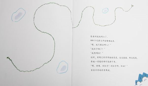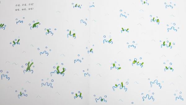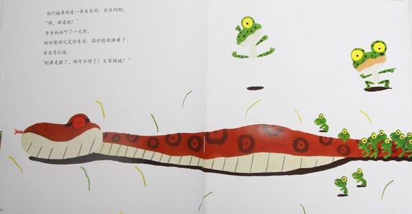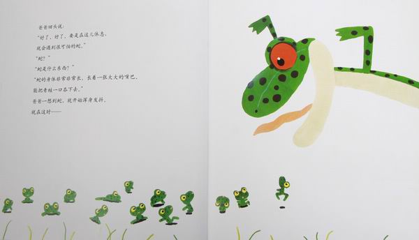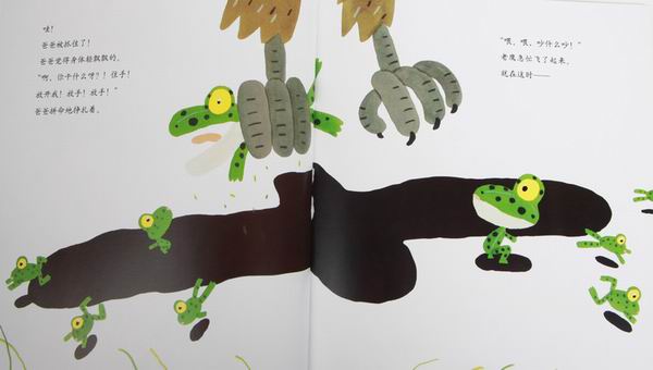 ![]() 阅读日期: 12月03日 参与人员: 妈妈和宝宝 阅读绘本: 《999个青蛙兄弟大搬家》 绘本特色:清新的画风,拟声词的灵活应用,冒险故事很精彩。 适读年龄: 2-8岁 阅读心得: ![]() 拿起这本书,我就被清新可爱的绿色吸引了。好的绘本,不但孩子喜欢,大人也喜欢。因为我们都有一颗童心嘛!呵呵 小日本虽然很可恨,但出的书还是不错的。那个——咳,咱也得公平一点儿嘛!这本书质量没的说,画风幼稚却好玩得很,青蛙爸爸惊恐的表情,青蛙兄弟调皮的样子。用词很生动形象:噌,噌,噌噌噌……呱,呱,呱呱呱……。内容也挺有趣。让我们也替它们担心:青蛙们能安全搬到新家吗? ![]() 春天来了,青蛙妈妈在池塘里生下了999颗卵。999颗卵变成了小蝌蚪。小蝌蚪长成了小青蛙,青蛙爸爸青蛙妈妈虽然高兴,但它们又犯愁了,因为池塘太挤了,于是,青蛙一家就开始搬家啦。你瞧,噌,噌,噌噌噌……青蛙蹦声音都描绘出来了。 小青蛙们一路的调皮,爸爸妈妈一路的小心,在遭遇了睡着的蛇之后和老鹰相遇了。 ![]() 老鹰抓走了青蛙爸爸,而青蛙妈妈抓着青蛙爸爸的脚,孩子们一个个抓前面青蛙的脚。 ![]() ![]() 老鹰刚开始还很高兴:“有这么多青蛙可以吃啊!”可是它太累了,终于将青蛙爸爸松开了,正让我们为青蛙一家的命运担忧的时候。青蛙一家幸运的“扑通,扑通,扑通”掉到了大池塘里。他们不但得救了而且还来到了新家。 ![]() 当小蝌蚪变成小青蛙说到池溏拥挤的时候,儿子一个一个地查小青蛙,我都要倒了,我说:”你别查了,看,已经告诉你了:是999个青蛙。“随着我讲的故事,我们跟着青蛙一家经历了一路惊心动魄的旅程。 青蛙一家一连串被老鹰抓上天空掉到池塘里那一页,儿子笑着翻了好几遍。还说:“掉水里了。”噢,他的意思是说:“幸好掉水里了。” 我读绘本的时候得很认真才行,儿子是一个字都不让我落下的。这次我读完会,儿子自己捧到一边去看了。然后又拿回来,指着“噌,噌,噌噌噌……”拟声词自己读个不停。我对儿子说:“团结力量大啊,要不然青蛙爸爸就会被老鹰吃掉啦!青蛙一家勇敢面对困难,终于搬到了新家。