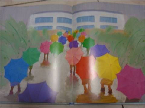 ![]() 阅读日期: 12月04日 参与人员: 妈妈和宝宝 阅读绘本: 《黄雨伞》 绘本特色:清新美丽的无声图画,让我们展开幻想。 适读年龄: 2-8岁 阅读心得: 这本书给我一种好清新,美丽的水粉画感受。四周的景色都灰蒙蒙的,衬托出了雨伞颜色的明媚。 就像我们也跟着黄雨伞走在雨中似的。 ![]() 这个故事我是这样讲的:下雨了,东东拿了一把黄颜色的雨伞走出了家门。一个人走路好孤单啊!这时蓝色雨伞出现了,他是他的好朋友,来陪着他一起走。走过小桥,走过喷水池……在路上遇到了许多拿着漂亮颜色雨伞的孩子。雨伞的颜色越来越多,蓝雨伞、红雨伞、绿雨伞、粉红雨伞……五彩缤纷。美丽宁静的画面上出现了许多把雨伞。各种颜色的伞聚在了一起像什么?雨中的雨伞像盛开的五颜六色的花朵,散发着幽香。伞下是“祖国的花朵”! ![]() 我问儿子:“你知道祖国的花朵是什么意思吗?”“就是像花。”我抱着孩子说:”我们大人啊,用祖国的花朵来形容小孩子的,就是说你们小孩像花朵一样,可爱又美丽。“ 儿子用小手点着上面的雨伞,每出现一把雨伞,他都要重复地查一次,还让我说出雨伞的颜色。我们听着CD,看着美丽的水粉图画。就像打着黄雨伞在雨中,一路上经过了心灵的洗礼。