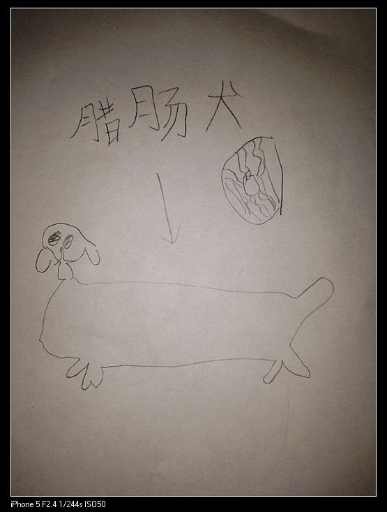 ![]() 20131209《点》——肯定孩子 阅读日期: 12月9日 参与人员:妈妈和宝宝 阅读绘本:《点》 绘本特色:这本适合喜欢画画的孩子。 适读年龄:3-12 阅读心得: 《点》讲的是一个很简单的故事:瓦士缇苦恼于不会画画,老师让她“尽情发挥”,她就大力地纸上画了一个“点”,但老师依然把这个“点”珍惜起来,并用一个波浪形的黄色金框装裱起挂在老师办公室。瓦士缇看到老师如此尊重和肯定自己的“画作”,突然有了信心画出更多的“点”,并成功举办了一次画展。 彤彤家的绘本来源主要有三种:彤妈喜欢的经典,彤妈不小心买回来的“包袱”,以及彤妈申请的试读书。《点》就属于第一种。与《点》类似的书还有《味儿》,都属于我们家的“珍品”。 《点》是那种反复读、从小读到大也不会厌倦的绘本,因为她的趣味性和深远意义同时俱备:不管你画得如何,都要肯定和相信自己。昨晚,彤彤自己找来读给妈妈听。 彤彤从来没有上过系统的美术班,所以在她的作品里你永远找不到“条条框框”,而是一些小线条,附带着一个小故事,都是她在生活中找来的“灵感”。 例如以下这幅画,就是她在外婆家找到小姨单位发的一套《世界名犬》后画的随笔,还根据自己对生活的理解写上了标题《腊肠犬》。她画完以后就随手扔了,是妈妈把它从“珍藏”起来的。