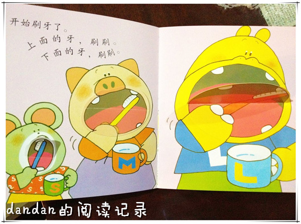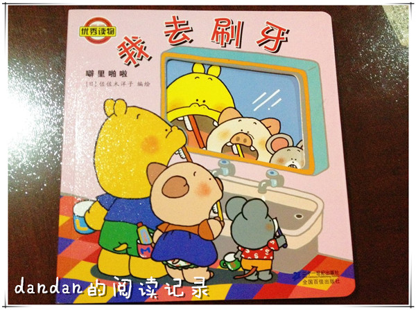 ![]() 阅读日期:12月7日 参与人员:妈妈和宝宝 阅读绘本:《噼里啪啦——我去刷牙》 绘本特色:学会刷牙 阅读年龄:0~3 阅读心得:低幼经典书又来了~~~ 这一次,河马、小猪和老鼠三个小朋友出门去郊游。 带了好吃的便当,有寿司、有饭团,还有三明治(话说,不亏是一个作者画的,饭团三明治跟小熊宝宝绘本里一样哈~~~) 吃完饭以后要干嘛呢? 仨人打开背包,拿出里面的牙杯牙刷,去刷牙咯! 刷牙的过程也很好玩,通过翻翻书,小朋友们学会了刷牙时要左右刷刷,上下刷刷,最后还要漱口,关键是漱口水要吐掉哈! ![]() 蛋蛋现在会很蹩脚的刷牙,不过仅限“刷”。 而且不会上下,只会左右。。。还经常刷不到牙齿上,然后就用牙咬着牙刷,咬啊咬,然后拿出牙刷来学着我们的样儿在水里涮牙刷。 感觉他更多的是沉浸在玩牙刷的过程中,而不是刷牙。。。 ![]() 也许很多日常生活,都是从游戏的兴趣开始培养的吧?(自我安慰中。。) 本作品未经作者许可不得转载,转载请征求作者意见。擅自转载使用,将保留追究其法律责任的权利! 个性签名