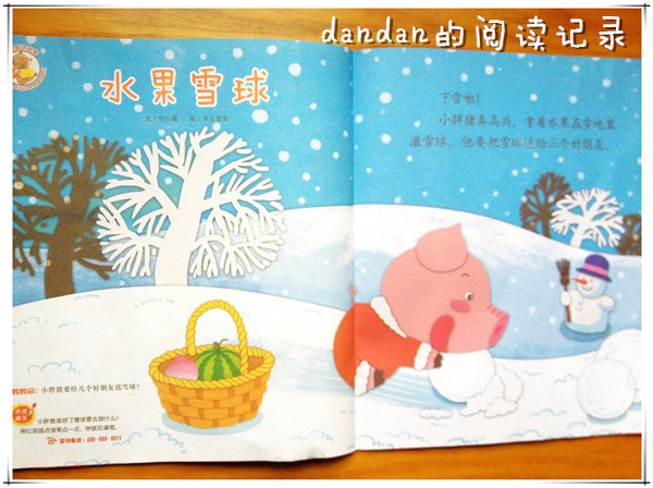 ![]() 阅读日期:12月10日 参与人员:妈妈和宝宝 阅读绘本:《婴儿画报》水果雪球 绘本特色:和朋友们分享 阅读年龄:0~3 阅读心得: 冬天来了,下雪了,到处都白茫茫的一片。 小胖猪的篮子里有三种水果,橘子、西瓜和菠萝,他看到下雪了非常开心。 于是跑出去堆了三个雪球,他要把这三个雪球送给他的小伙伴们。 于是他的小伙伴们分别收到了小胖猪送来的雪球。 他们把雪球放在屋子里,结果呢…… 雪球开始融化,脱掉了白色衣服的雪球露出了它们本来的面目——水果儿~~~ 哈哈,小伙伴们很开心,收到小胖猪送来的水果礼物! 下雪对于南方的孩子来说是种奢侈的礼物,因此对于雪球这种玩具更是相当期盼啊。 所以虽然没有见过下雪,蛋蛋还是很喜欢书里的雪的。 小胖猪想出的这个别具一格的小礼物,还真是可爱而有趣。 小伙伴们的友谊,也正是通过平日里一点一滴的积累而形成的哦。 另外,雪这个东西,可是会因为温度的升高而融化呀,就像之前看的鼹鼠的故事里,那个小雪人就是因为温度升高而开始融化,所以只能呆在雪山顶上咯。 本作品未经作者许可不得转载,转载请征求作者意见。擅自转载使用,将保留追究其法律责任的权利! 评分记录