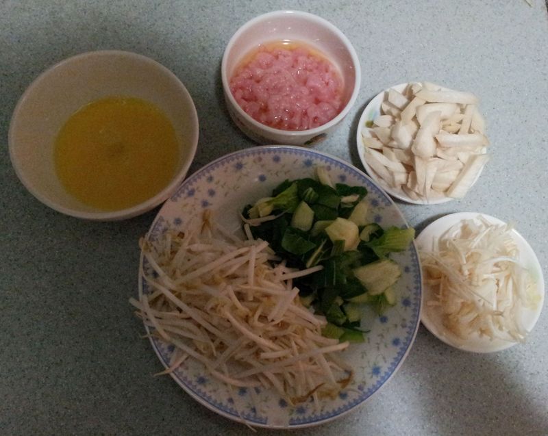 配菜:鸡蛋、肉丁、鸡腿菇、金针菇、油菜、豆芽。 调味品:眼、糖、胡椒粉、料酒、香油、辣椒酱。