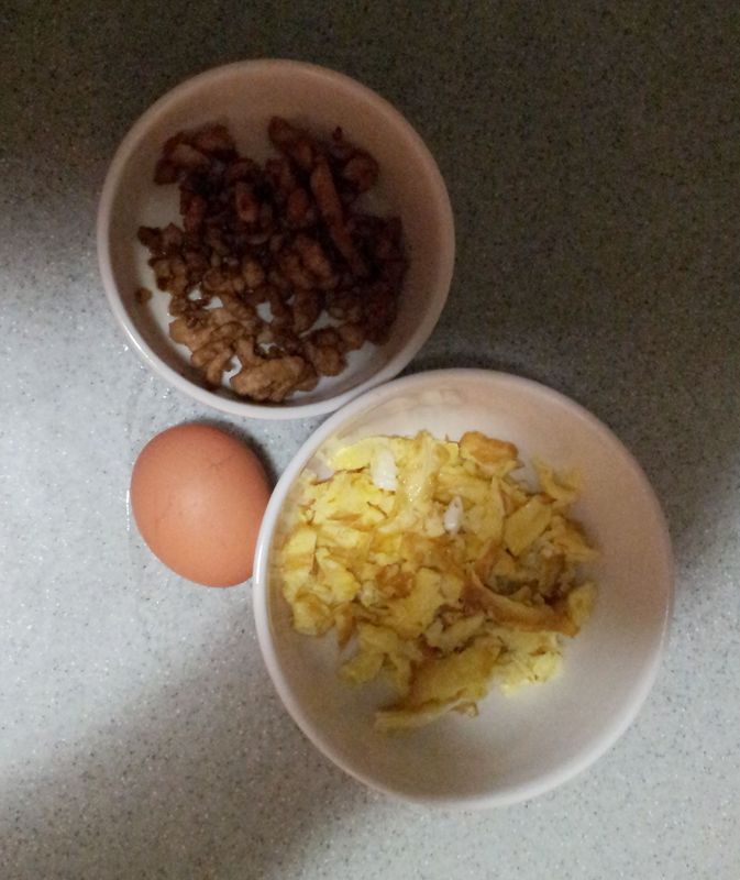 步骤: 1.蒸米饭。 2.一个鸡蛋,摊成鸡蛋皮,切丝。