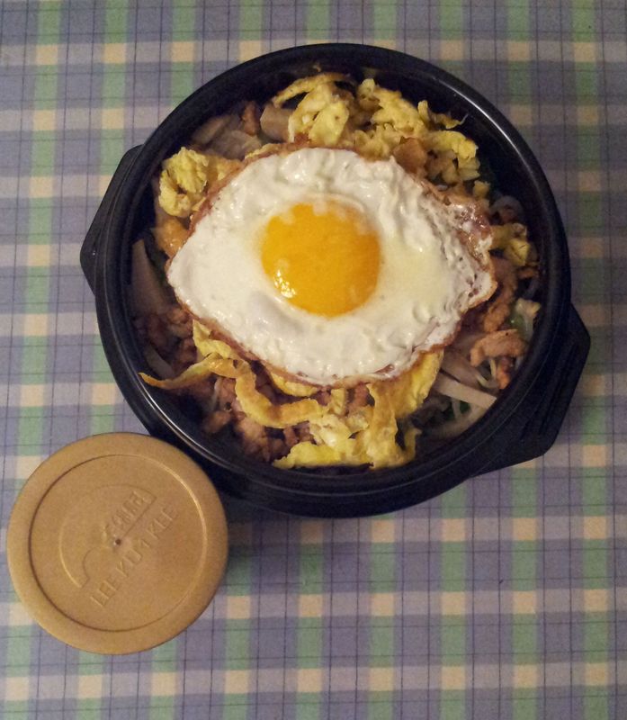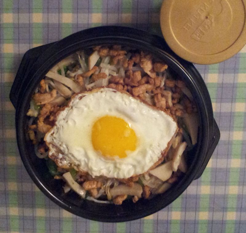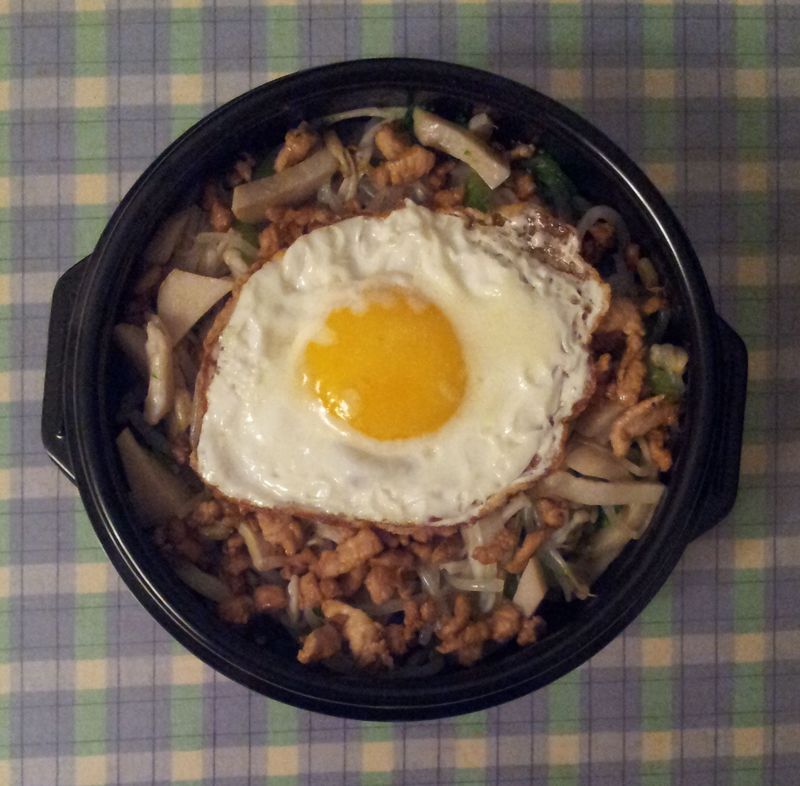 3.肉丁用料酒腌制,炒熟,撒入盐和少量胡椒粉。 4.水烧开,鸡腿菇、金针菇、油菜、豆芽均焯熟,然后用少量盐和香油拌匀。 5.再用一个鸡蛋,单面煎。 6.石锅底部涂薄薄一层香油或橄榄油,将蒸熟的米饭盛入,压平。 7.在米饭上码好蔬菜、鸡蛋和肉丁,最上层放煎蛋。 8.石锅放火上,小火,待听到滋滋响的声音时即可关火,此时米饭最下面微微有点糊,有香香的锅巴味道。 9.据个人口味放入适量辣椒酱,拌匀。 10.开吃。