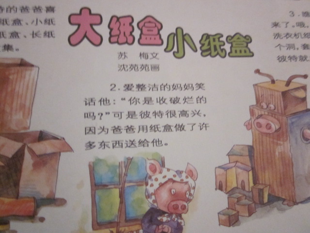 阅读日期:12月7日 参与人员:妈妈和宝宝 适读年龄:2-8岁 阅读心得:家里面的废旧纸盒你们都是怎么处理的呢?看看这个故事后您会怎么做,哈哈,快和宝贝一起动手动脑玩创意,利用废旧纸盒可以做很多好玩的呢。 小猪爸爸喜欢收集纸盒,各种各样的,大的,小的,长方形,正方形,圆形,……他通通都收集,爱整洁的妈妈笑话他是搜破烂的,可是小彼特却很高兴,因为爸爸用这些纸盒做了许多东西给他,瞧,机器人来了,哦,这就是爸爸在洗衣机纸盒上挖了几个洞,套在彼特身上,彼特就成了机器人。 彼特的玩具柜里,小桌子,小椅子是彼特和爸爸一起用火柴盒粘成的,那么多的大纸盒干什么用呢?爸爸把他们沾到了一起就变成了长长的火车,呜呜呜 火车开起来了。 妈妈的生日到了,彼特和爸爸做了两个漂亮的纸盒面具,他们一人一个,表演节目逗妈妈笑,他们还把纸盒装饰的很漂亮送给妈妈,作为生日礼物,妈妈也慢慢的喜欢上了各种纸盒。 本作品未经作者许可不得转载,转载请征求作者意见。擅自转载使用,将保留追究其法律责任的权利! 个性签名
