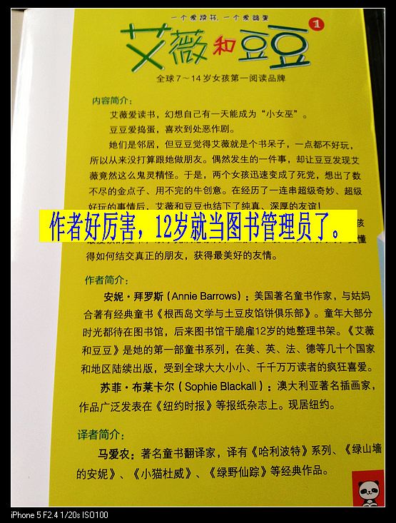 20131211《艾薇和豆豆》——当心 阅读日期: 12月11日 参与人员:妈妈和宝宝 阅读绘本:《艾薇和豆豆》 绘本特色:这本适合小学阶段的孩子。 适读年龄:6-12 《艾薇和豆豆》讲的是两个女孩子交朋友并一起寻找快乐、共同成长的故事。昨天念了第六章,讲的是豆豆参观了艾薇的房间,那里有五个区域,豆豆和艾薇“相见恨晚”,非常有默契地完成了一个女巫的“包装”。在这一章里,豆豆和艾薇的房间估计功能都是一样的吧:睡床、学习桌、衣柜、玩具堆...可是,在孩子们的眼里,“别人家的孩子”很讨厌,“别人家的房间”却是另一个美妙的世界!所以,艾薇的房间对豆豆来说相当于一个新的游乐场! 想想,“过家饭比较香”就是这个道理吧:我们的孩子,都喜欢到“别人家吃饭”,咸菜都比我家的鱼翅强。因为孩子的世界很小,在成人之前都被“捆”在家长周围;孩子的世界又很大,她们的思想天马行空,根本不知道会给你什么样的惊喜。 豆豆应该很有“设计师”的天赋,因为她根据自己的理解彻底地“改造升级”了艾薇的女巫装扮。好期待下一集会发生什么事耶。 彤彤现在天天都要我念《艾薇和豆豆》,我烦的是她什么时候才自己阅读。 本作品未经作者许可不得转载,转载请征求作者意见。擅自转载使用,将保留追究其法律责任的权利! 个性签名