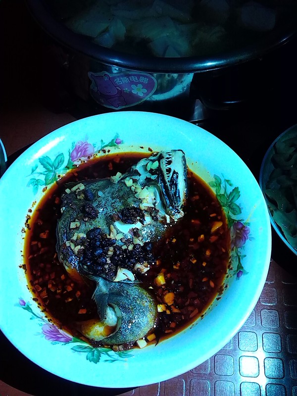![]() 这道菜的照片倒是半个月前就拍好了,只是我实在太懒,一直拖到现在才来发。不过也好,就当做是庆贺Aric当版主的一道贺礼吧,我要半个月前发了不就没了吗?嘿嘿,所以说,有时候懒也是很有必要滴。 ![]() 闲话少说,下面介绍这道菜的材料:鸦片鱼头一个 说实话我真的很不喜欢这个鱼头,看着好丑,但是大家可不要被它的外表所欺骗了,其实它的味道相当的鲜美哦。 ![]() 这个老干妈也是必须的,少了这个,鱼头就少了一道最主要的味了。 ![]() 生姜大蒜也是必不可少的,全都给剁碎了 ![]() ![]() ![]() 先把生姜放上去,再舀几勺老干妈放在鱼头上,再然后倒入一袋黄酒,这个也是必须的哈。 然后放边上晾它个半个小时 ![]() 要准备吃的时候放进锅里蒸二十分钟 ![]() 出锅喽! 因为是晚上拍的,所以看着不怎么好看,但吃起来味道真的非常好哦。大家可以试试呢。 本作品未经作者许可不得转载,转载请征求作者意见。擅自转载使用,将保留追究其法律责任的权利! 评分记录