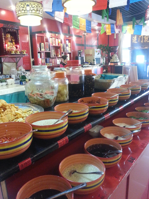 取料台的西侧,是自选蔬菜区,五元一位,自取,禁止浪费。蔬菜都非常的新鲜,是我们常用的涮菜。 再往里,是散客区,黄色的椅套,让我有点正黄旗的赶脚。。。哈哈。。。散客区的环境也不错,以竹帘隔开走廊,竹帘上的装饰物都比较大方典雅,清新脱俗。