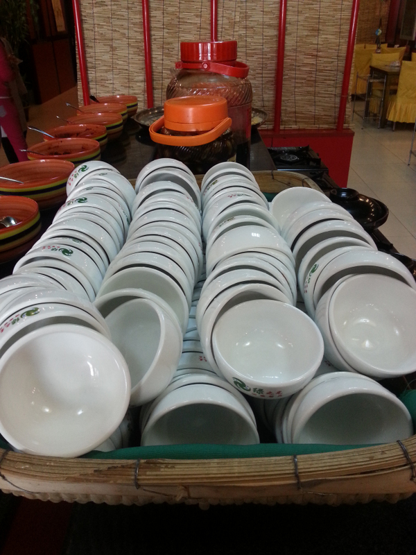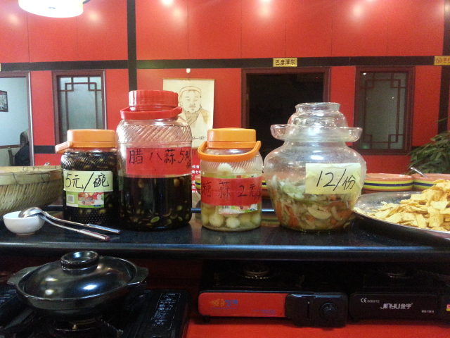 简单叙旧后,就开始到处猛拍了,既然是探店嘛,当然要多拍几张啦。首先映入我眼帘的是一个摆放小料的取料台。正面摆放的是洗好的小碗,我特地看了一下,很干净。。。左侧是各色的小料,剁椒、酱豆腐、海鲜汁……一应俱全,白芝麻颗粒饱满,辣椒油清澈见底,花生碎焦酥适中,光这小料看了就让你食欲大增。台子的右侧是泡菜、糖蒜、腊八蒜,明码标价,童叟无欺。吃着羊肉,就着泡菜,即爽口又解油腻。