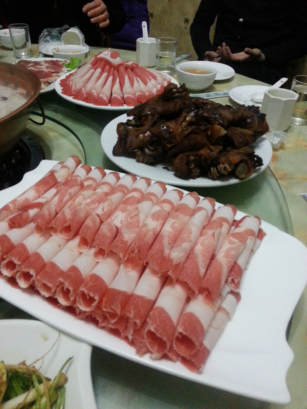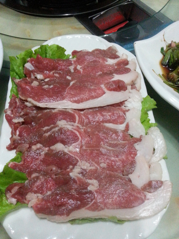 一边悠闲地拍照,一边等待着其他朋友的到来,不一会大家相继而来,我们也被请进了包房,热气腾腾的铜锅已经架在来煤气炉上,底料沸腾,暖意荣荣。桌子上已经摆了好多小菜,还有大盘的羊肉,肥牛,店家正在推出的元宝肉,来自河北省张家口市,肉质鲜美,关键是分量十足,足斤足两,35元一盘,跟外面卖的一样,真是相当实惠呢。