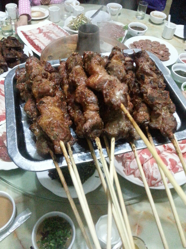 谈笑间,服务员又端上了一盘羊肉串,这是我见过的最大的肉串了吧,哈哈,很霸气呀,孙总说,一斤肉串六串,配以孜然、辣椒粉,那股香味早就窜入我的鼻子了,一口气吃了一大串,意犹未尽,哈哈。