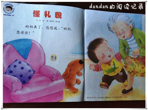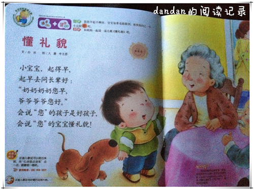 ![]() 阅读日期:12月14日 参与人员:妈妈和宝宝 阅读绘本:《婴儿画报》我会对长辈说“您” 绘本特色:学会用“您” 阅读年龄:2~4 阅读心得: ![]() 这期的婴儿画报,说的是文明礼貌的用语。 悠悠又变成了好孩子的典范,见到奶奶会说“您”。 比如,和奶奶说:“您请坐。”,“奶奶您喝水。”,“奶奶您吃水果。” 等等。 对于您的使用,初衷是希望孩子们能懂礼貌,对于长辈都要用“您”这个称呼。 不过, 我觉得可能还是得分年龄,比如对于2岁多甚至更小一些的孩子。