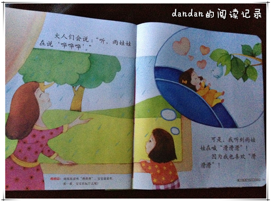 ![]() 阅读日期:12月15日 参与人员:妈妈和宝宝 阅读绘本:《婴儿画报》滑滑滑 绘本特色:孩子的世界想象力无穷 阅读年龄:1~3 阅读心得: 这几天开始,貌似进入了雨季,一天天的都在下雨,而且气温也一天比一天低。 好处就是,雾霾散了。 可是,孩子们却没法去户外玩啦! 那么对于下雨,孩子们的世界里是怎么想的呢? 这个《滑滑滑》的故事,就很有趣。 它把小雨点拟人化成了一个个调皮的小朋友,雨点落到树叶上,落到小花小草上,都变成了小雨点在滑滑梯。 顺着滑滑的树叶、小花小草滑落下来。 当然,还有屋顶啊,雨伞啊……都变成了调皮的小雨点的游乐场,它们在开心地滑滑梯呢。 ![]() 妈妈和宝宝说,外面下雨啦,“哗哗哗”。 而小宝宝却说,下雨了,小雨点儿在说“滑滑滑” 把下雨这个讨厌的事情,描述成了孩子们喜闻乐见的滑滑梯的方式,多有趣啊~~~ 看来很多时候大人和孩子们对于同一个事物的想法还真是不一样呢! 本作品未经作者许可不得转载,转载请征求作者意见。擅自转载使用,将保留追究其法律责任的权利! 个性签名