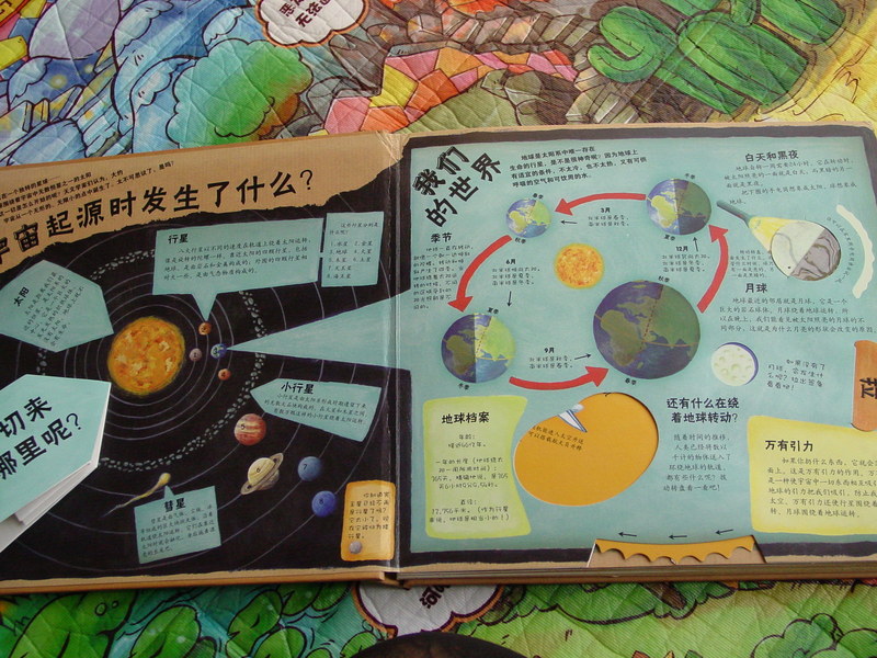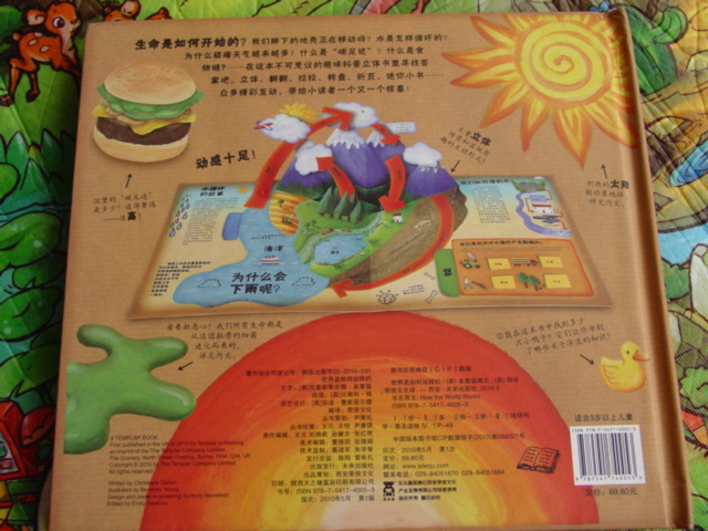 那天,看到朋友说有乐乐趣童书的秒杀,就赶紧准备参加,吼吼,连续一周,每天都有秒杀,可是我只在第一天秒上了,小虎说他也秒到了,都是宝贝喜欢的书,秒到以后,可以自己选择书名,我就为阳选择了这本关于地球的好书,其实自己最喜欢的还是那些适合rain的低幼的好书,本来想着接着继续秒,结果一次都没有成功!可能人家都记住了我的ID了,每次看到都要下单了,可是出来验证码让我填写,就错过了!错过就错过了吧,把机会让给更多爱书的孩子也不错哦!不过这一本宝贝还是超级喜欢! 看阳阳抱着这本书,就知道这本书的块头有多大了吧,是不是够帅气,够土豪啊!一打开,里面机关重重!让你研究不停,探索不停! 每一处的小机关,阳都不放过,都要挨个儿去发现,去寻找! 哇塞,好漂亮的一颗大树啊,吼吼,这一页是竖着看的哦! 奈何大家见个面,露出正脸给大家看看!未来出版社的好书,乐乐趣的好书!一起让乐乐趣的会动的书来告诉我买了很多的有趣的地理知识吧! 翻开第一页,告诉我们宇宙起源时发生了什么?我们的世界,这个地球又是如何运转的哦!图片非常的逼真,文字也很简单易懂! 看到了什么?哈哈,原来是用一个爆炸的折纸来向大家展示这个宇宙的形成的原因,这个地球的形成的真正的故事! 看,这一边,有拉 这个字的地方,你就可以把这个纸片拉出来,就会有惊喜发现! 下方还有可以转动的齿轮呢!转动一下,就可以看到更多的新奇的知识! 看,关于盘古大陆的这一页,上面还藏着一本小书,是一本无字的小书,却简单形象的告诉我们我们的盘古大陆是如何慢慢的演变成现在这个样子的! 在这张椭圆形的世界地图下面,人们可以看到地球内部蕴藏的一些秘密哦! 看到了吗?孩子们通过这翻翻书,不但非常形象的了解了地球内部的构造,还同时学习了很多的地理知识! 这一章关于水循环的故事更是非常的生动!一翻开看,马上看到一座突兀的大山! 海水为什么会运动呢?这张图片就能够非常形象的让孩子们了解海水运动的原因和很多的一些知识! 关于碳资源的实用,关于自然界的温室效应,宝贝能够看到一流的老师在面对面额给孩子讲地理,讲科学!有趣的翻翻卡片,我们会更加的喜欢,更加的爱上阅读,爱上探索! 看这个可爱的汉堡包,好多层啊,每一层都告诉我们什么呢?打开啦看看吧! 哦原来是告诉我们每一层的配料需要耗费多少克的碳,这一个大汉堡耗费了1,26千克的碳,那可是19个大汉堡的重量 ! 这一页要竖着看,告诉我们煮无视如何生长的!一打开就是一颗立体的大树,是不是很炫哦!秋天树叶为什么会落下来,如何才能够防止土壤流失,森林告急了!等等很多的小知识都在这里学习到哦! 知道什么是食物链吗?能量的金字塔里面,我们构成了食物网!看这些凸起的图片,真的很像一张大网哦!孩子可以通过这些形象的大网里面的各种生物,了解我们的地球,了解我们吃的什么,食物从哪里来等等知识,这个网一下子就把孩子们的知识连在一起,串通起来了! 非常非常的棒的一本书,只要你是喜欢探索的孩子,只要你是喜欢地球的孩子,只要你是喜欢阅读的孩子!你就不会放过这本好书! 本作品未经作者许可不得转载,转载请征求作者意见。擅自转载使用,将保留追究其法律责任的权利!