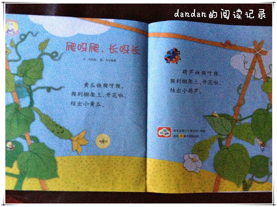 ![]() 阅读日期:12月16日 参与人员:妈妈和宝宝 阅读绘本:《婴儿画报》爬呀爬,长呀长 绘本特色:成长的过程 阅读年龄:1~3 阅读心得: ![]() 两个小秧苗,一个是黄瓜秧,一个是葫芦秧。 分别在架子的两头生长。 它们爬呀爬,长呀长。 黄瓜秧开花了,花谢后结出小黄瓜;葫芦秧也开花了,花谢后结出了个小葫芦。 长呀长,爬呀爬。 它们终于在腾架子的顶端会师了~~ 小黄瓜和小葫芦在风中摇晃碰撞着,打着招呼。 不断长大的它们,也变成了大黄瓜和大胖葫芦~~~ 这个小故事讲述了黄瓜和葫芦的生长过程,从小苗到开花再到结果。 对于这个简单的不能再简单的小故事,我的解读是: 这个过程让我觉得也很像小朋友的成长,一开始小小嫩嫩的,充满着希望。 然后便义无反顾地生长,成长的过程总是充满着惊喜与期待。 只要有信心和希望,假以时日,等到开花结果后,就迎来了丰收。 我的小臭蛋,你也要健康快乐地长大哟! 不要因为一时的挫折而放弃向上的希望呀! 本作品未经作者许可不得转载,转载请征求作者意见。擅自转载使用,将保留追究其法律责任的权利! 个性签名